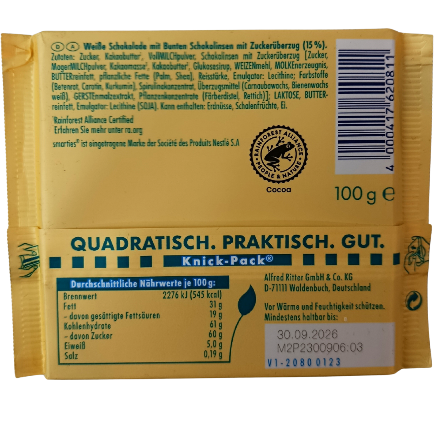 Шоколад Ritter Sport Smarties білий з кольоровими шоколадними драже 100g