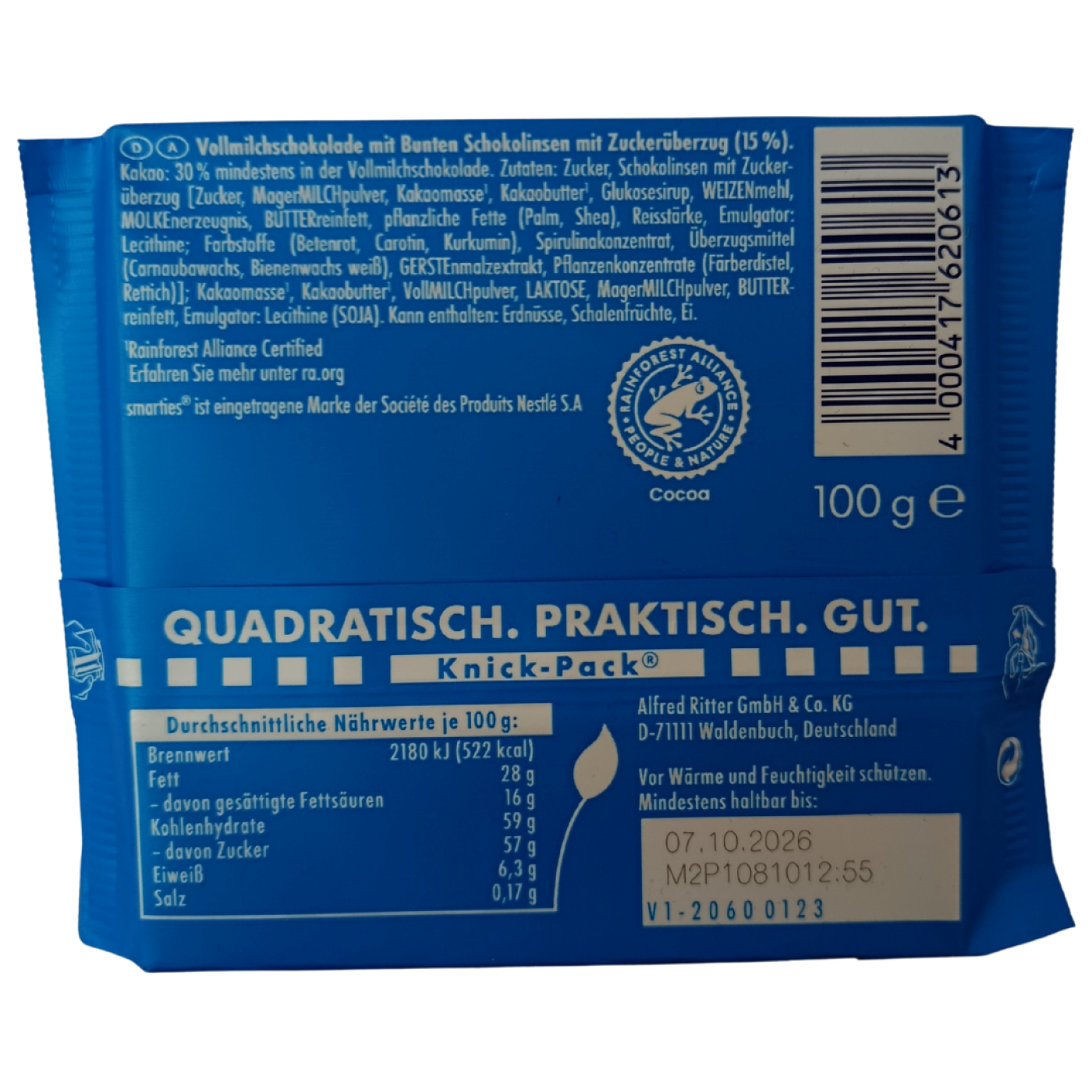 Шоколад Ritter Sport Smarties- це молочний шоколад, в якому присутні кольорові шоколадні драже Smarties. Цей шоколад поєднує в собі ніжний смак молочного шоколаду з хрусткими драже, що додає веселощів та яскравості. Ідеальний вибір для любителів солодощів, які хочуть насолодитися кольоровими акцентами у своєму десерті!