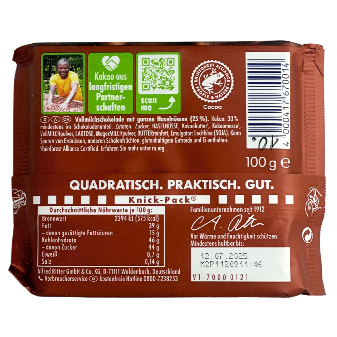 Ritter Sport Voll-Nuss молочний з цільним фундуком, 100 г — це класика від німецького бренду, яка поєднує ніжний молочний шоколад і великі, хрусткі цілі горіхи фундука. Завдяки ретельно відібраним горіхам і високоякісному шоколаду, кожен шматочок дарує насичений смак і приємну текстуру. Цей шоколад виготовлено без штучних добавок, що гарантує натуральність і справжнє задоволення. Ritter Sport Voll-Nuss — ідеальний варіант для любителів шоколаду з горіхами, чудово підходить для перекусу, частування гостей або солодкої перерви протягом дня.