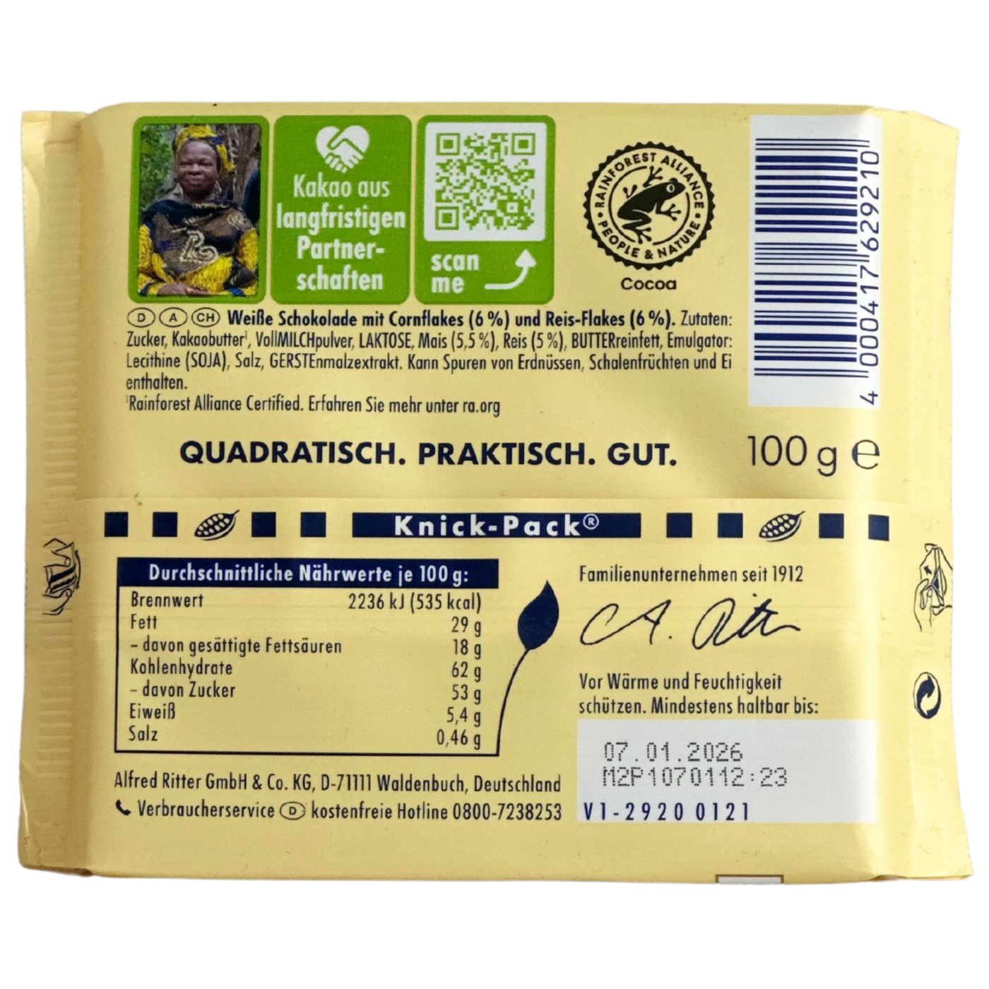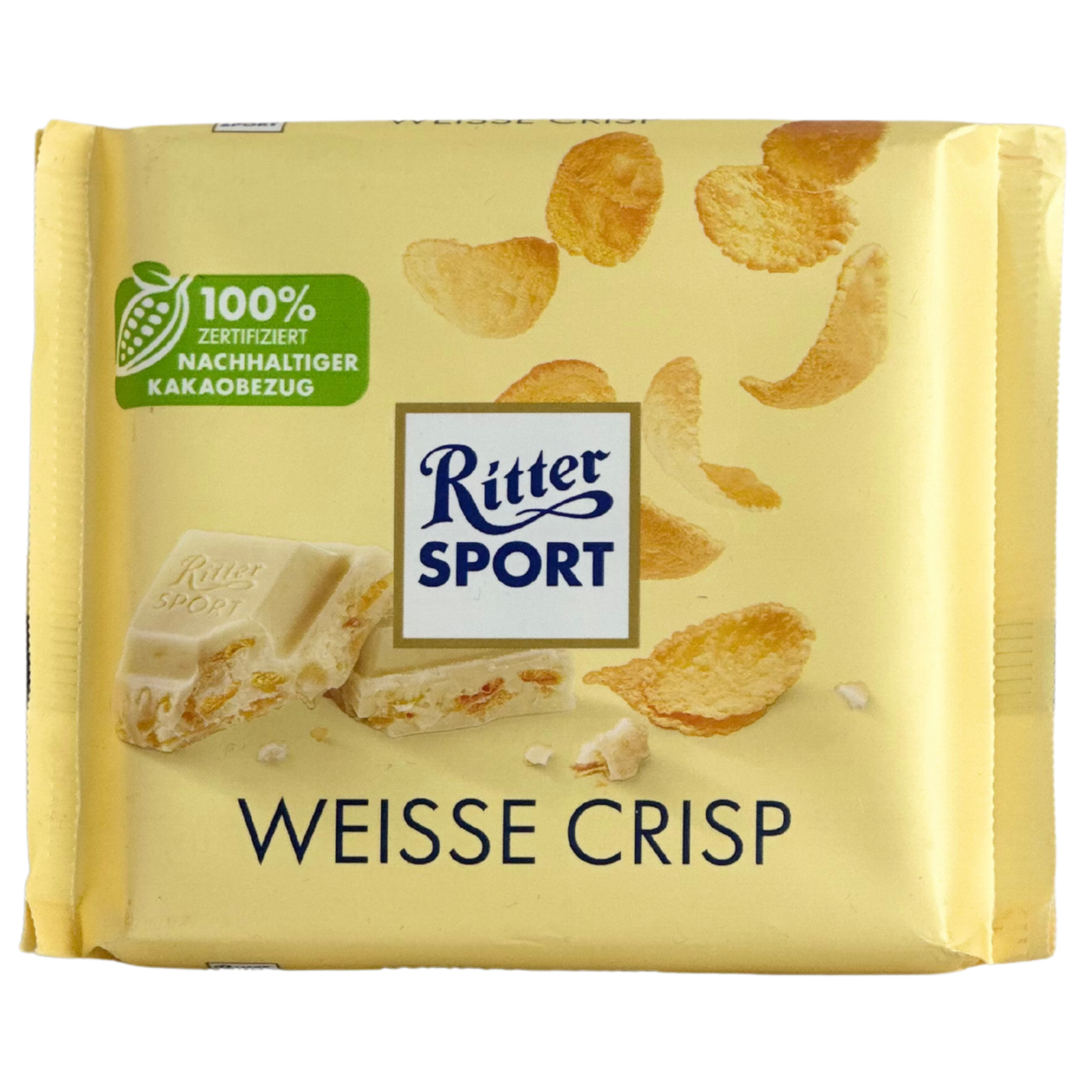 Шоколад Ritter Sport Weisse Crisp білий з кукурудзяними пластівцями 100g. Чудове поєднання білого шоколаду з кукурудзяними та рисовими пластівцями. Смажена кукурудза та рисові пластівці роблять шоколадку подвійно хрумкою. У поєднанні із молочною ноткою білого шоколаду створюється гармонійний смак.