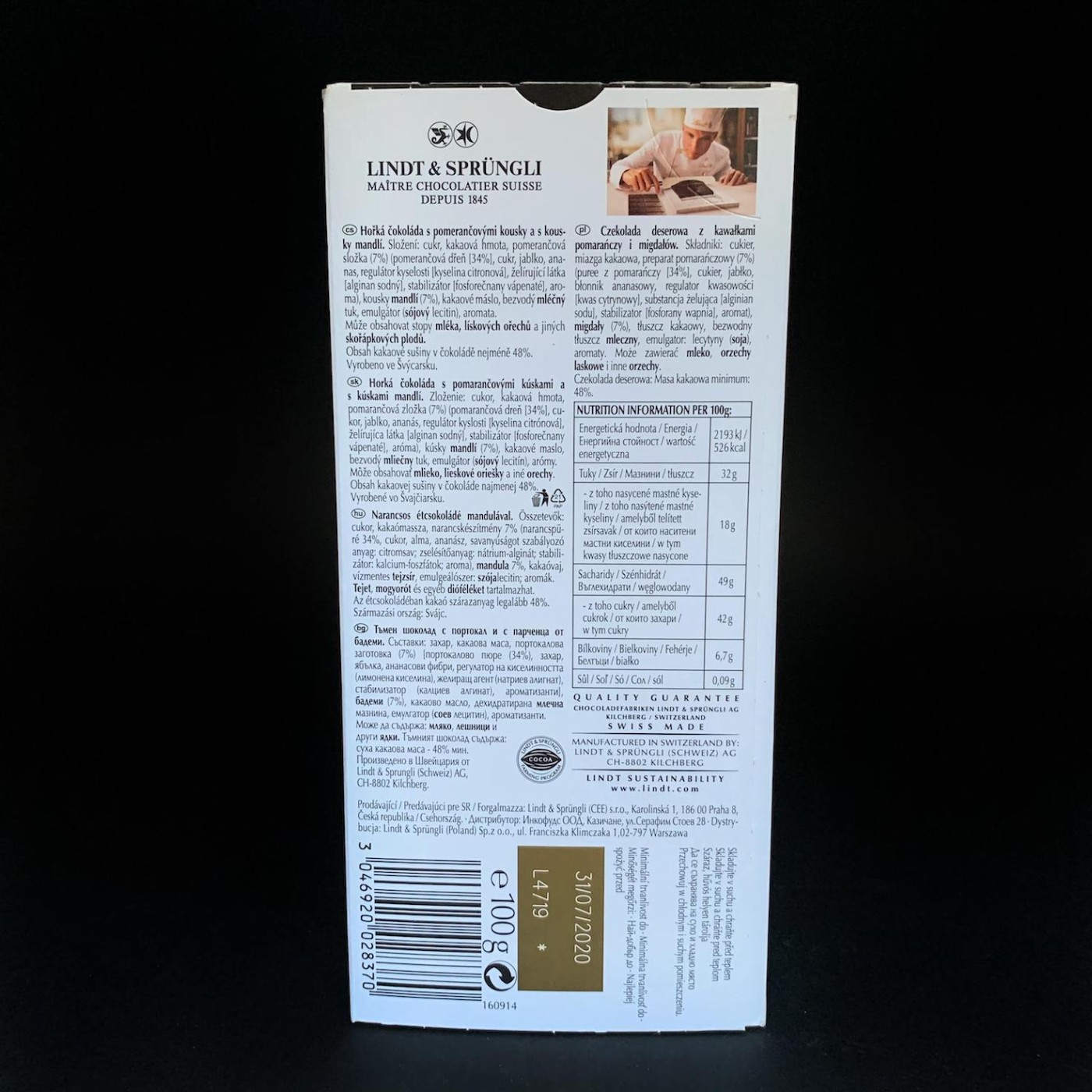 Lindt Excellence Intense orange – винятковий темний шоколад від швейцарського виробника, який має насичений смак апельсину та містить подрібнений мигдаль. Це дійсно вдале поєднання смаків, яке не залишить байдужим і подарує особливі відчуття. Продукт характеризується високим вмістом какао (мінімум 48%), завдяки чому вдалось отримати вишуканий смак з делікатною гірчинкою.