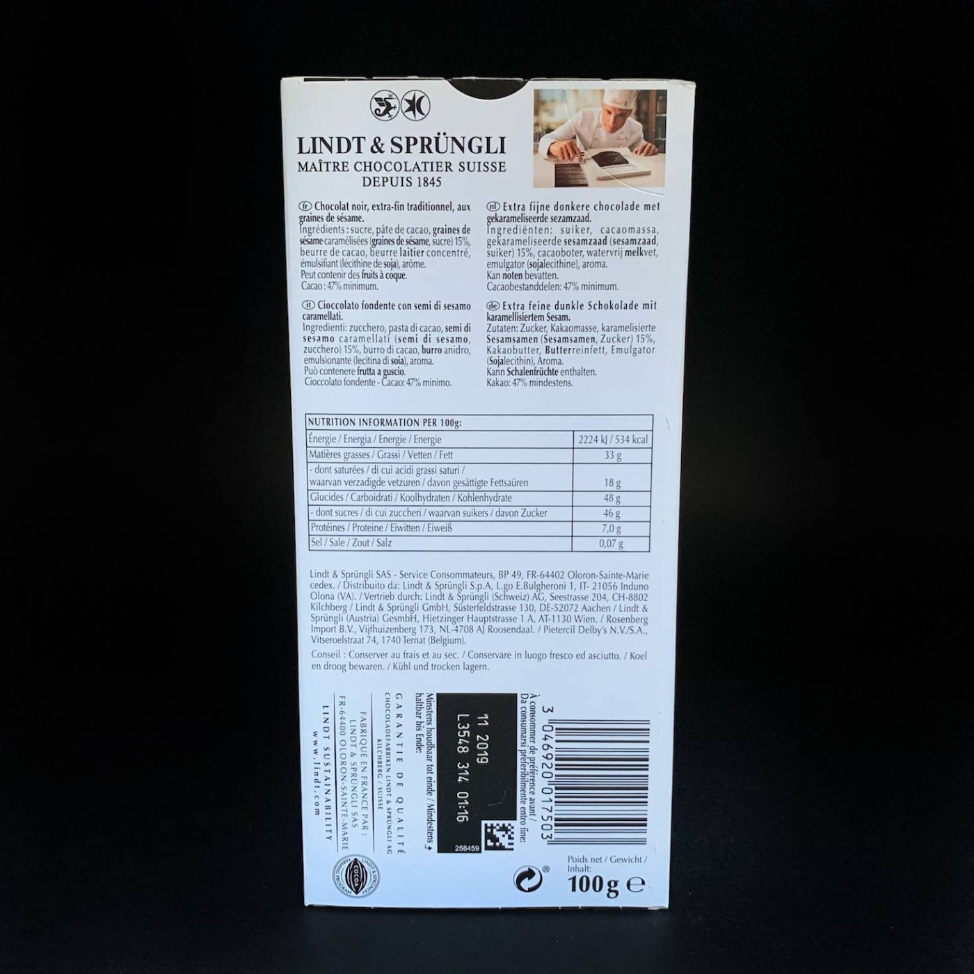 Sesame Grille – вишуканий шоколад від швейцарського виробника Lindt, відомого на весь світ завдяки високій якості. В складі міститься смажений сезам, який дарує особливий смак та користь, адже він багатий на білок, мікро- та макроелементи. Вміст какао мінімум 47%, тому відчутна делікатна гірчинка.