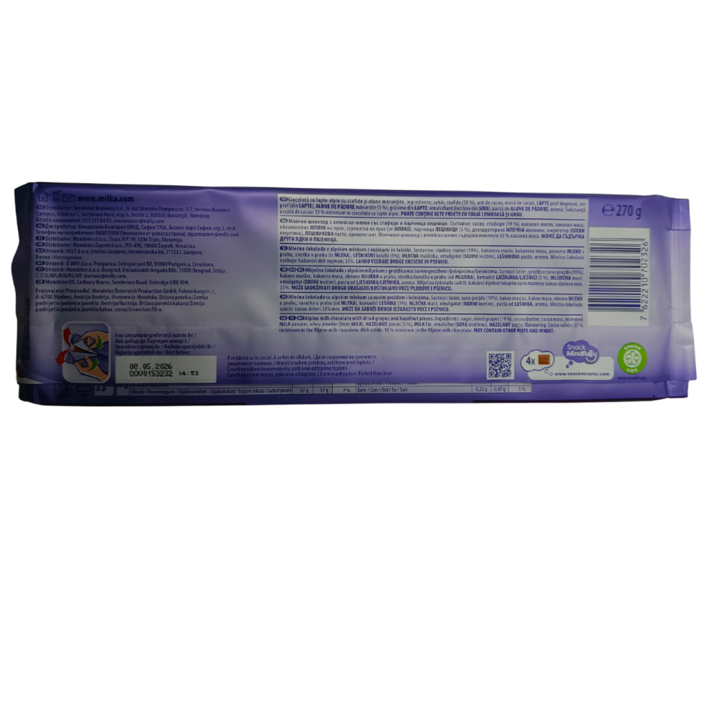 Молочний шоколад Trauben-Nuss від Milka містить родзинки та шматочки фундука, які створюють ідеальний дует. Продукцію від Мілка полюбляють у всьому світі, адже вона виготовляється з якісних інгредієнтів з додаванням 100% альпійського молока, яке дарує справді ніжний смак. Шоколад з родзинками та фундуком в форматі XXL – це чудовий подарунок, який завжди буде влучним. Також смачна плитка стане поживним перекусом на протязі усього дня, який неодмінно піднімить настрій.