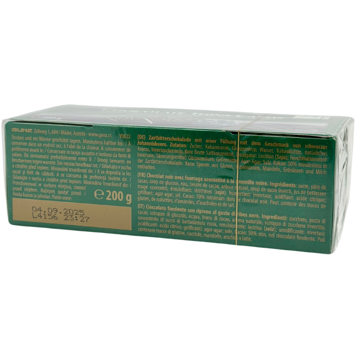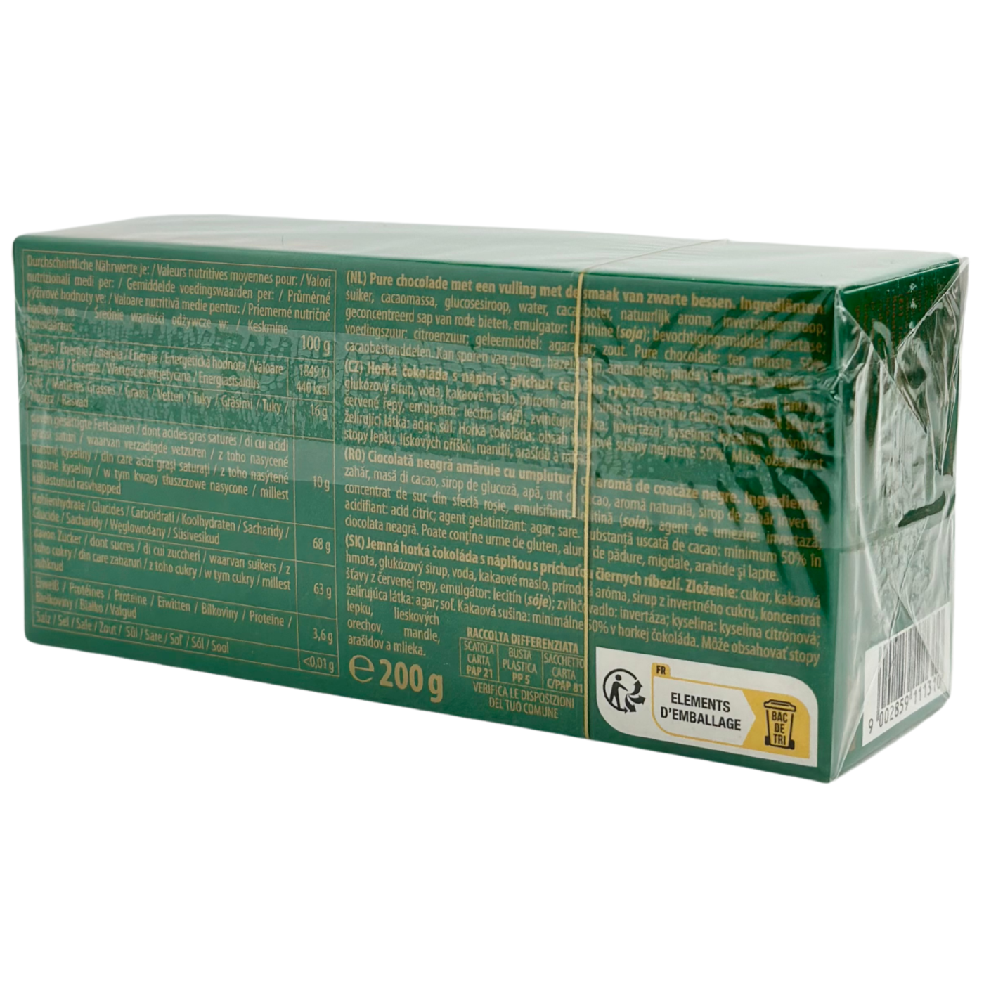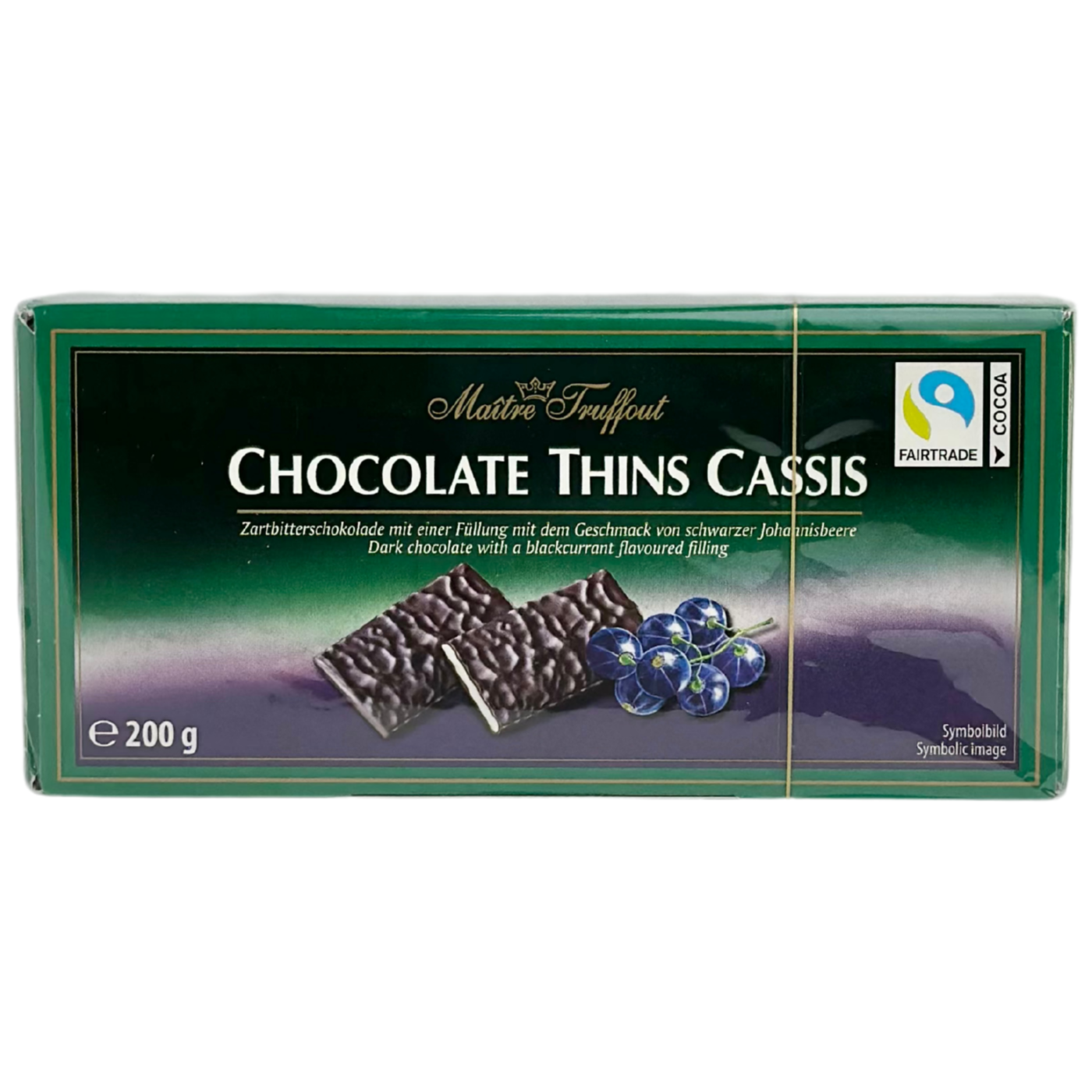 Шоколадні пластини з смородиною Chocolate Thins Cassis 200g. Шоколад з чорною смородиною від австрійського виробника Maitre Truffout - це плитки з з ніжного чорного шоколаду з кислуватою начинкою, які ідеально підійдуть до вашого чаю або кави. Компанія використовує шоколад найвищої якості, тому смак у нього дуже ніжний і водночас насичений. В упаковці 16 маленьких плиток, загорнутих в окремі упаковки, що дуже комфортно для використання.