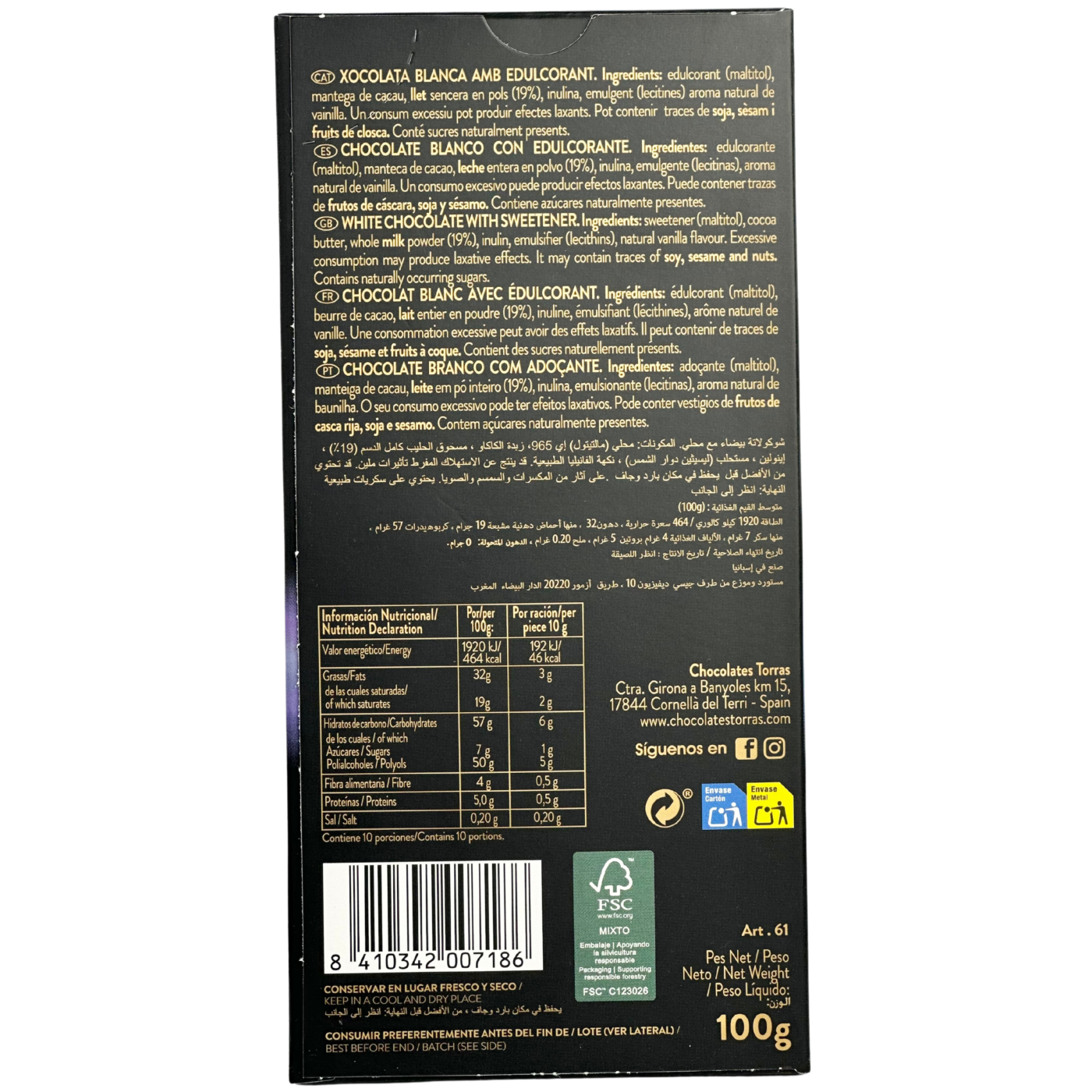 Шоколад білий без цукру з ваніллю Blanco White Torras 100g