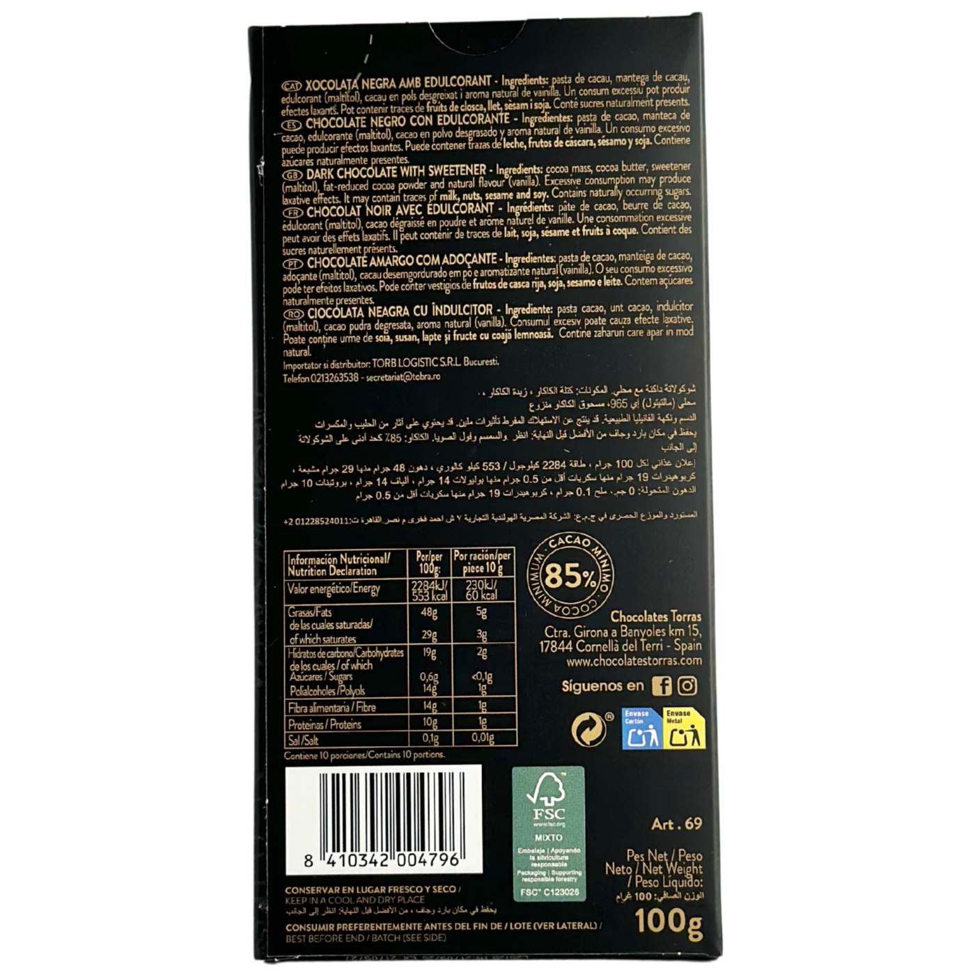 Шоколад Dark від Torras відрізняється високим вмістом какао (85%) та глибоким натуральним смаком. Гіркий шоколад не містить цукру, його замінив мальтіт, який дозволяє насолоджуватись солодким без шкоди для фігури та здоров'я.