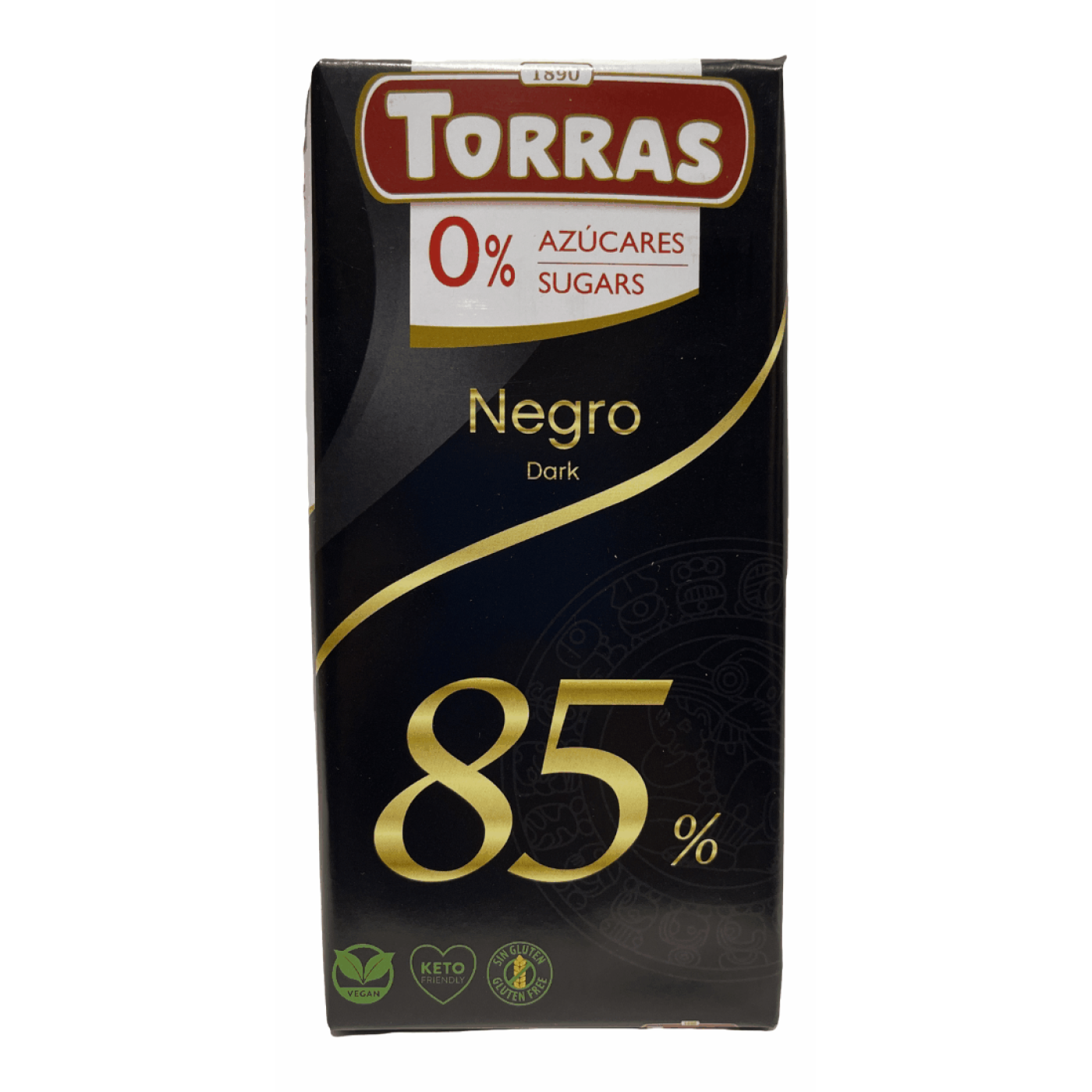 Чорний шоколад без цукру Torras Negro Dark 85%. Іспанський шоколад порадує любителів вишуканого чорного шоколаду , який не містить цукру та глютену. Замість цукру до його складу входить підсолоджувач мальтит, тому ідеально підходить для людей, які вживають продукти з низьким вмістом цукру. Він стане чудовим десертом та приємним подарунокм людині, яка стежить за харчуванням.