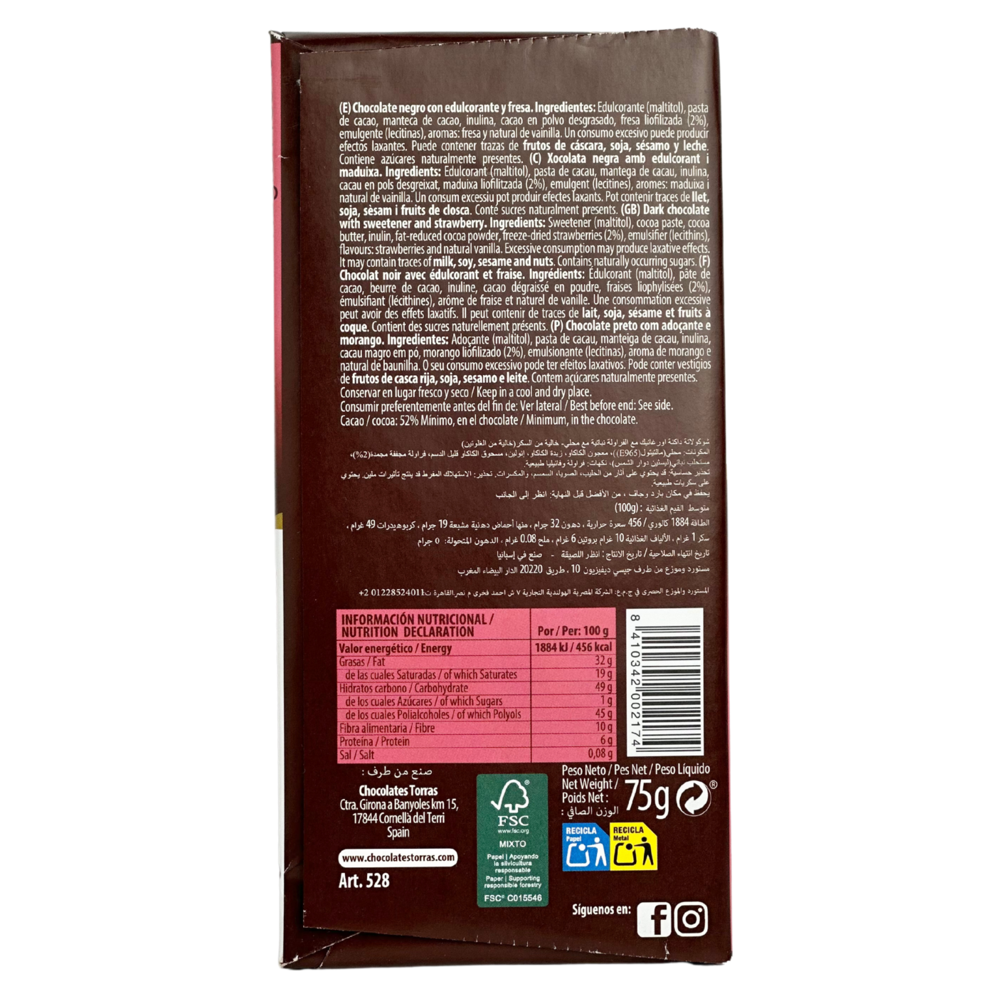 Смачний шоколад від Torras Dark and Strawberries подарує справжню насолоду! Темний шоколад ідеально поєднується зі свіжою полуницею, а відсутність цукру у складі дозволяє насолодитись солодким без докорів сумління. Іспанський виробник використовує мальтит, який не шкодить здоров’ю та фігурі, а також підходить людям, які притримуються дієти.