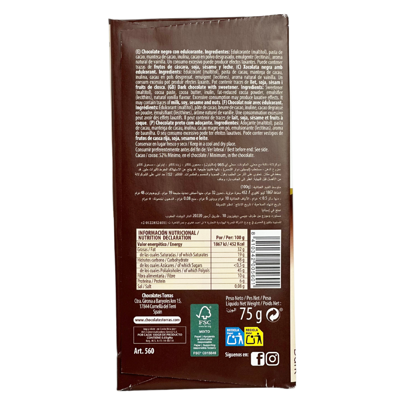 Torras Negro – класичний темний шоколад від виробника з Іспанії, який пропонує найякісніші солодощі. Він має багато переваг: насичений смак, відсутність цукру та глютену, що робить його доступним абсолютно для усіх споживачів. Замість цукру в складі мальтитол – натуральний підсолоджувач.