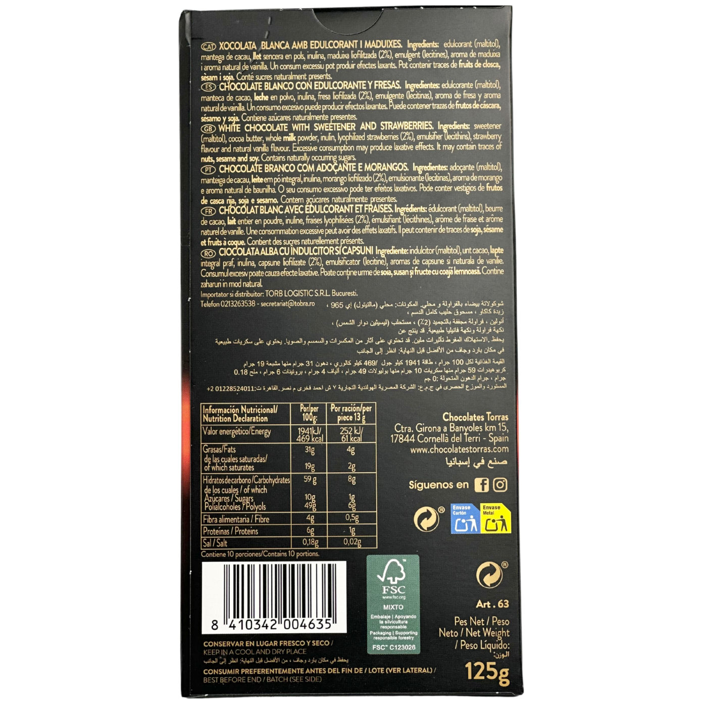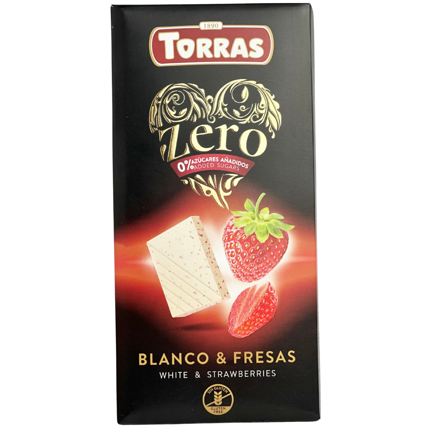 Для усіх любителів білого шоколаду Torras пропонує класичний білий шоколад з полуницею, яка додає особливого смаку. Продукт не містить цукор, замість звичного підсолоджувача у ньому міститься мальтіт, що дозволяє насолодитись солодким під час дієти.