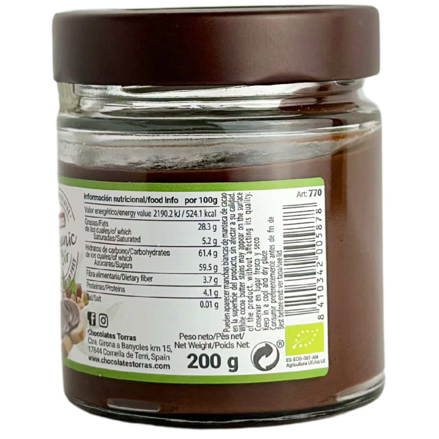 Іспанський виробник Torras як завжди пропонує найякісніше, на цей раз шоколадно-горіхову пасту Crema de Avellanas y cacao Bio. Це органічний продукт, виготовлений з найкращих інгредієнтів, виробник використовує тростинний цукор замість звичайного і якісну олію Екстра Вірджин, багату на корисні речовини. Паста не містить пальмової олії, лактози і глютену, тому її можуть споживати усі, хто вимушений дотримуватись особливої дієти. Підходить для веганів.