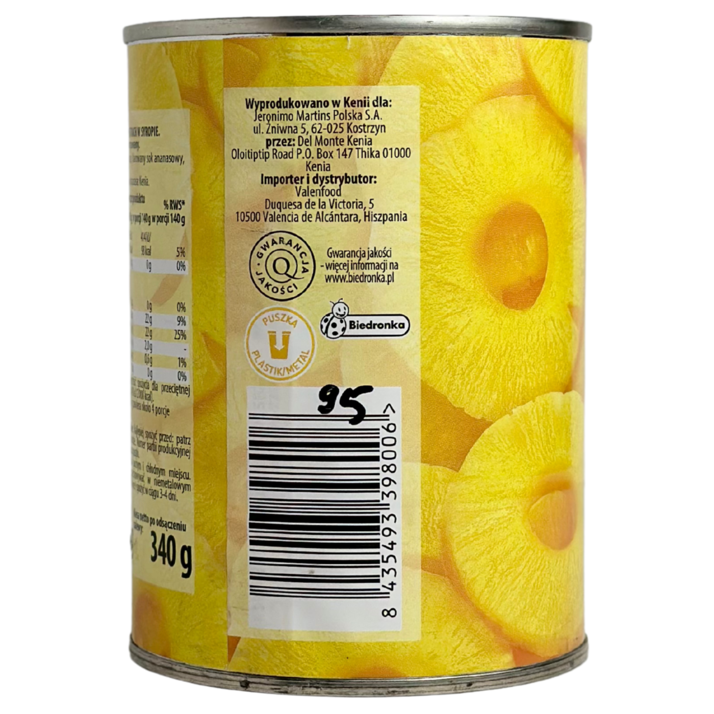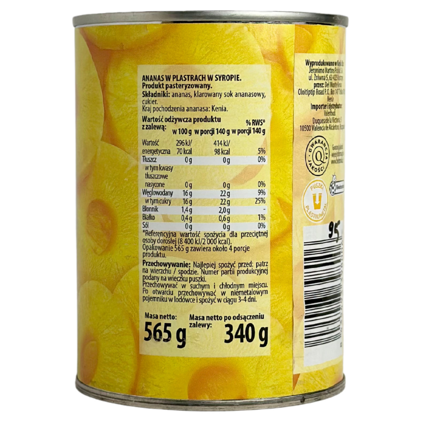 Ананас консервований нарізаний кільцями середньої товщини.Багатий на вітаміни і освіжаючий на смак, цей продукт ідеально підходить для вживання як самостійно, так і в приготуванні десертів, коктейлів і салатів.Він соковитий і має солодкий, з легкою кислинкою смак.