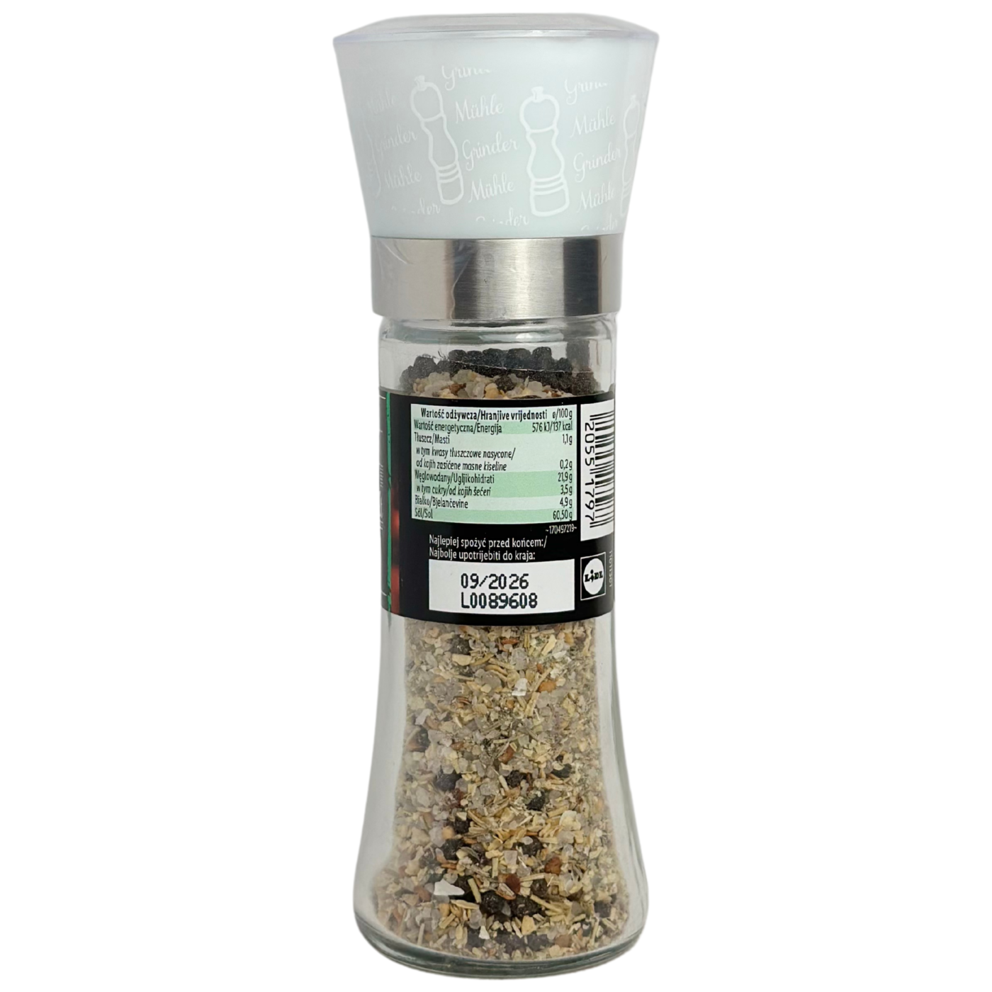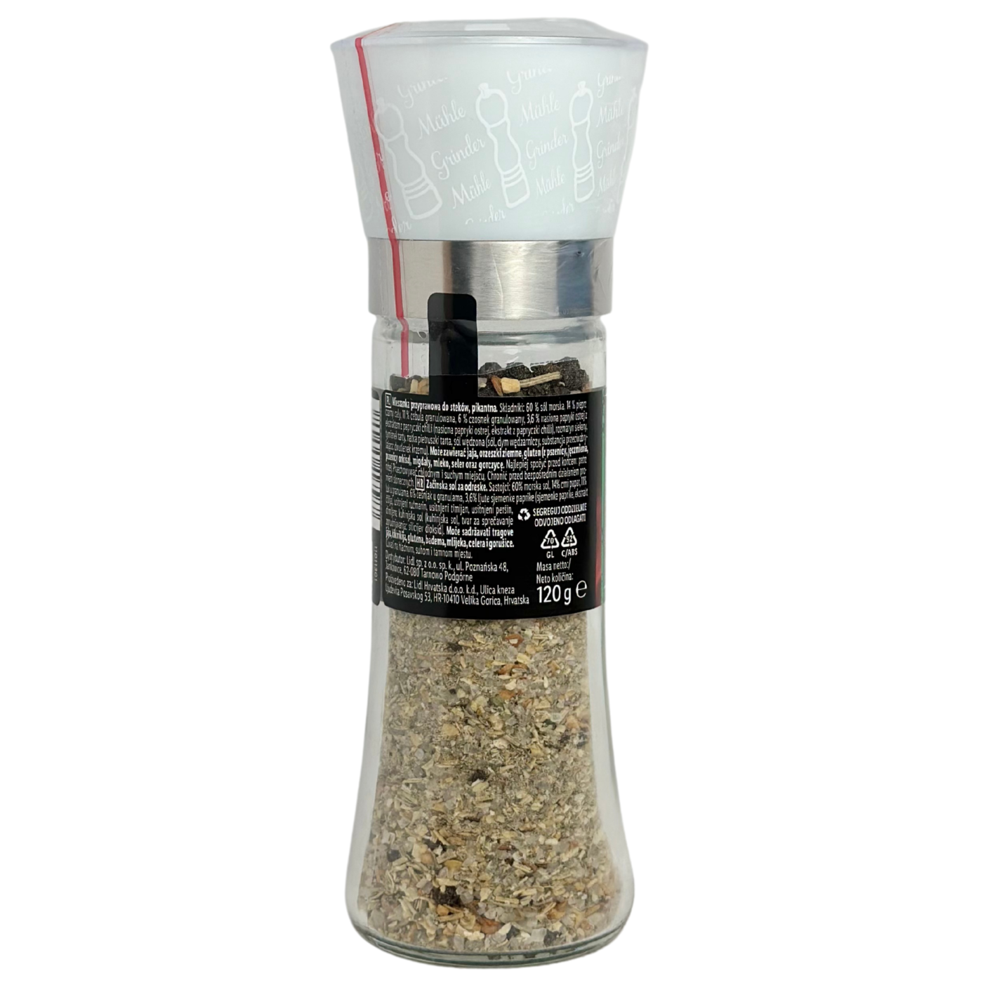 Суміш ароматних спецій з млинком для приготування стейків. До складу входять: сіль морська 60 %, перець чорний горошком 14 %, цибуля сушена, гранульована 11 %, часник сушений 6 %, насіння паприки гострої з екстрактом перцю чилі 3,6 %, розмарин, тим'ян, петрушка, сіль. Спеції нададуть вашим стравам ексклюзивного смаку та аромату.