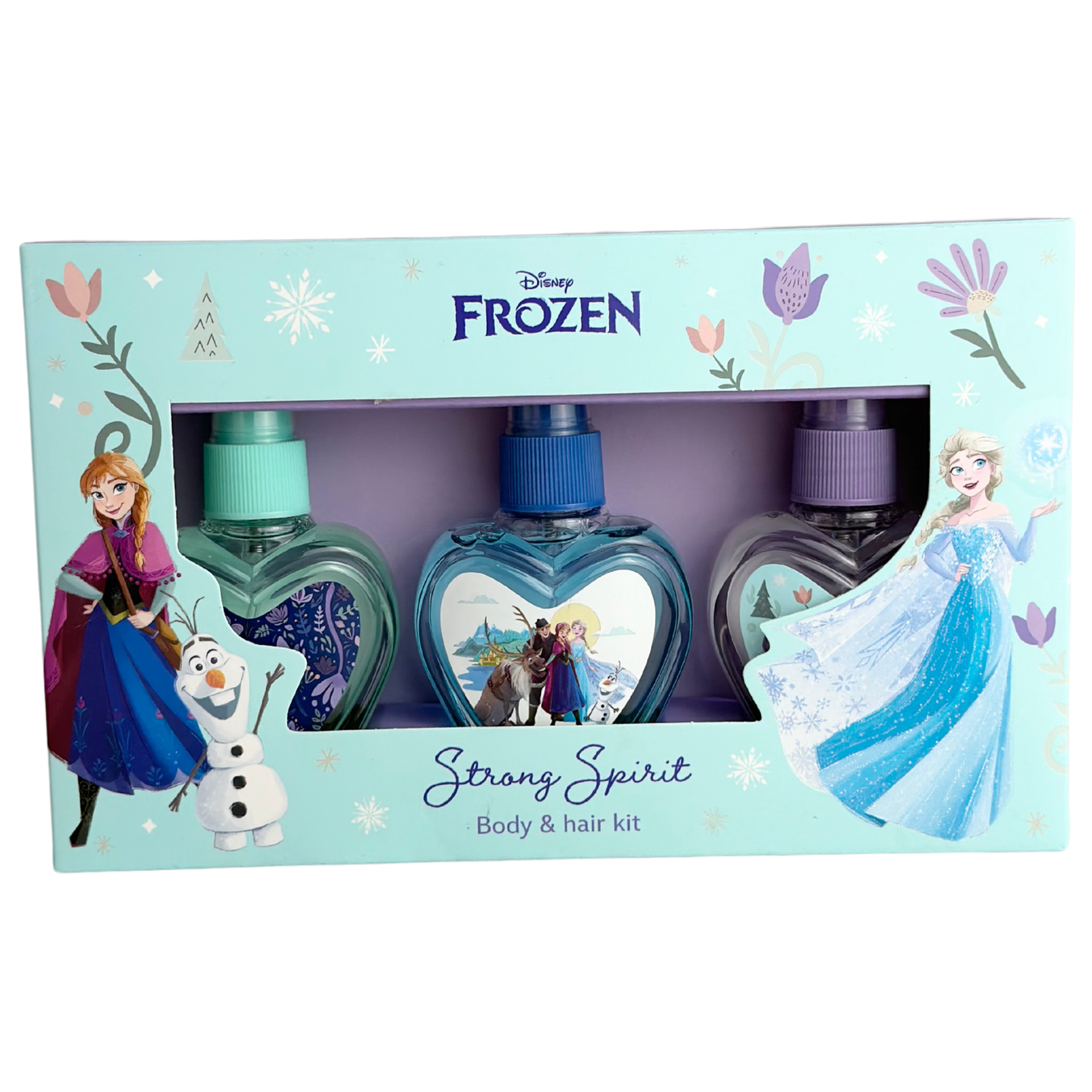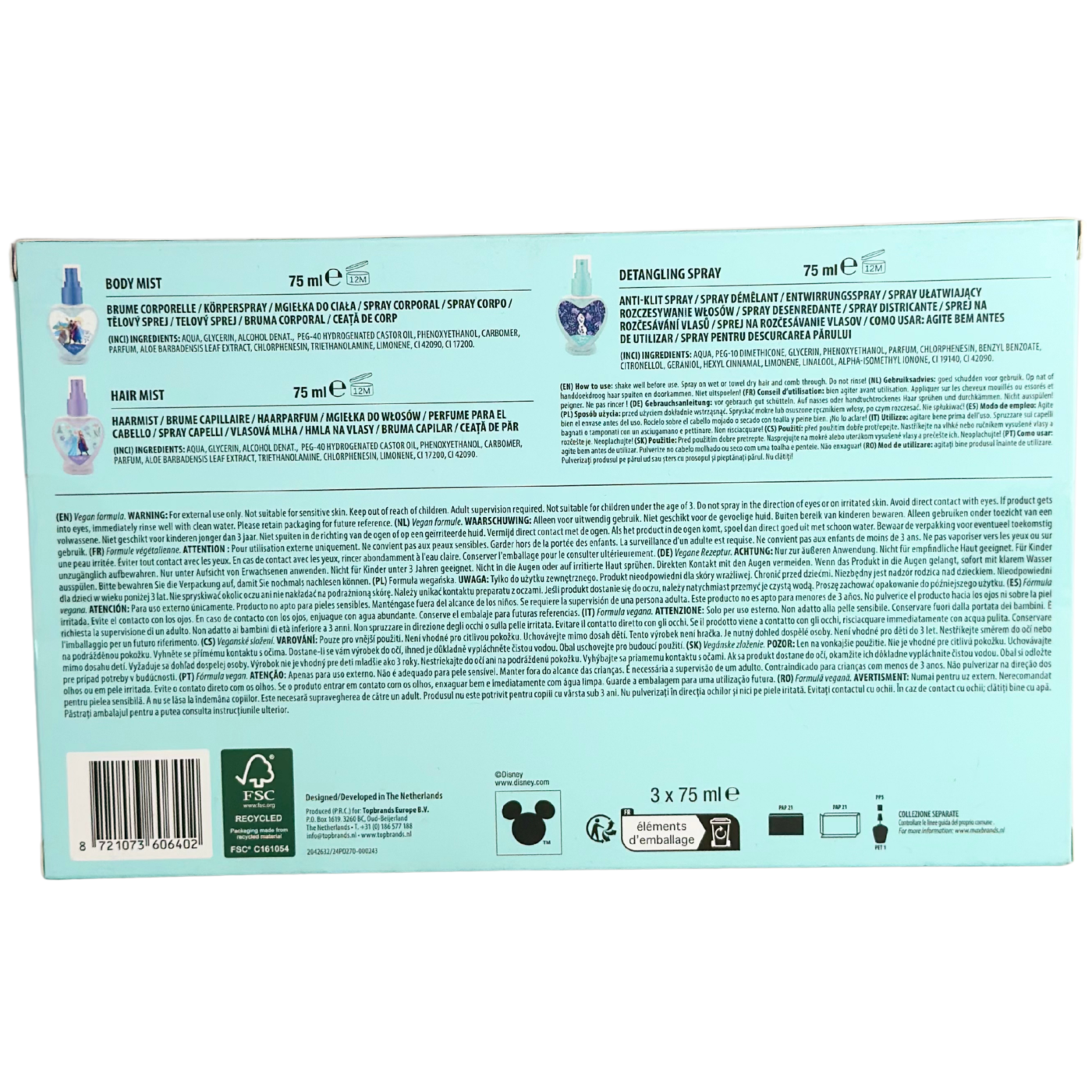 У наборі три флакони по 75 мл кожен, оформлені в стилі анімаційної історії Дісней Крижане Серце. Спреї створені з урахуванням особливостей дитячої шкіри та волосся, забезпечуючи мʼяке та безпечне зволоженея.
