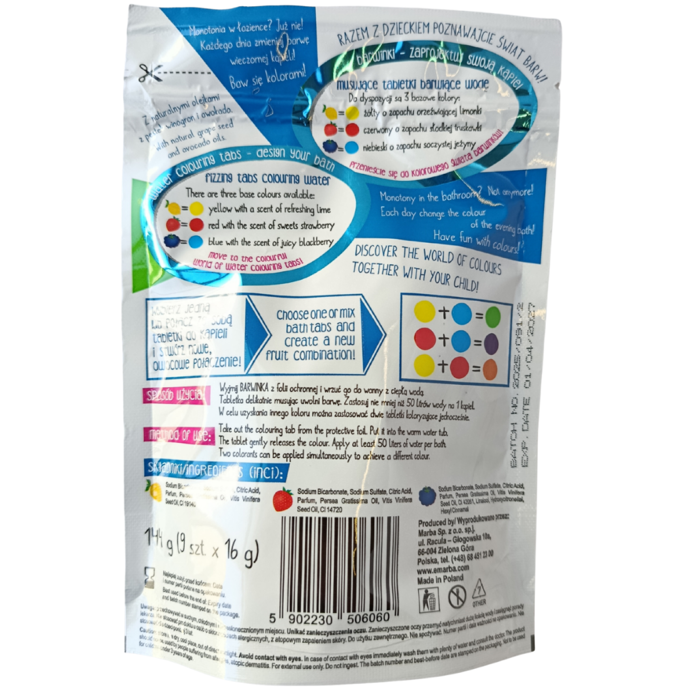 Таблетки-барвники Barwinki Marba — це яскравий та веселий спосіб перетворити звичайне купання на захоплюючу гру. При контакті з водою таблетки починають шипіти та забарвлюють воду у насичені кольори, створюючи ефект справжнього “кольорового SPA” для дітей. Продукт ідеально підходить для щоденного використання — він не лише розважає, а й робить процес купання більш приємним і цікавим для дитини. Таблетки можна використовувати окремо або комбінувати між собою, отримуючи нові відтінки води. Формула збагачена доглядовими компонентами, які допомагають зволожити та пом’якшити шкіру.