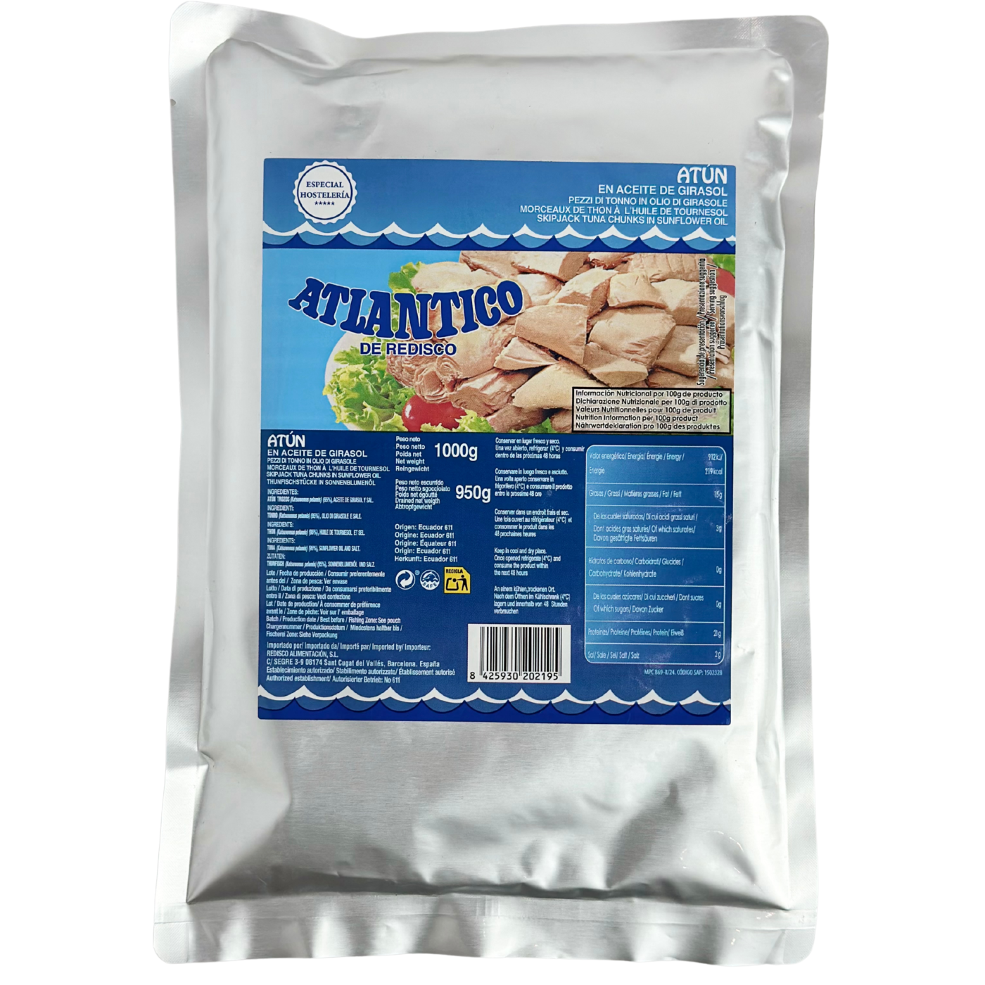 Тунець – це справжній скарб, оскільки в ньому міститься безліч корисних речовин: жирні кислоти, вітаміни, мікро- і макроелементи та білок. Atun Claro від Atlantico пропитаний рослинною олією (всього 50 гр!) він має ніжний смак та ідеально підходить для здорового харчування, оскільки він не тільки корисний, а ще й містить мінімум калорій. Тунець Атлантіко продається в великому об'ємі, його кількості вистачить, щоб приготувати страви для величезного святкового столу.