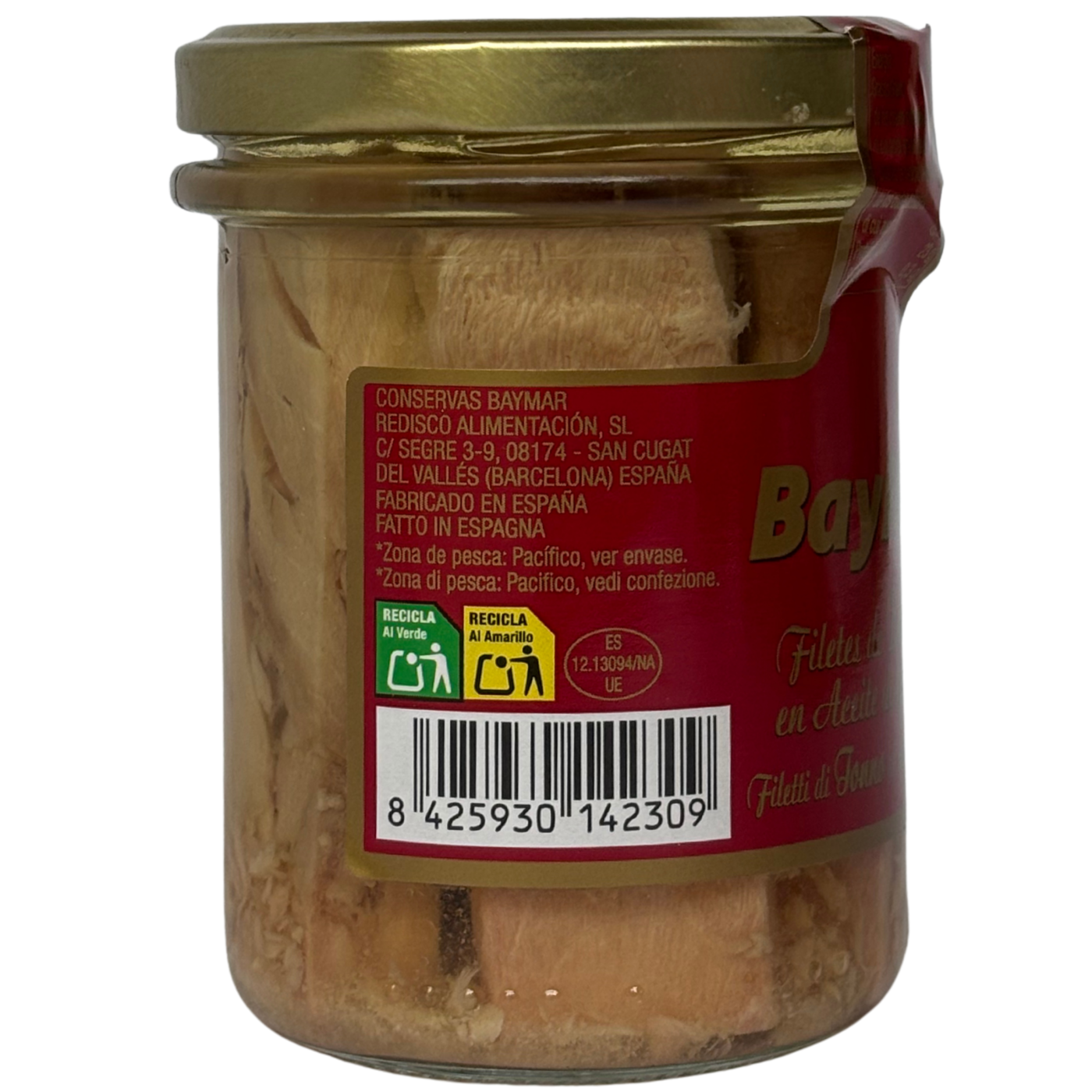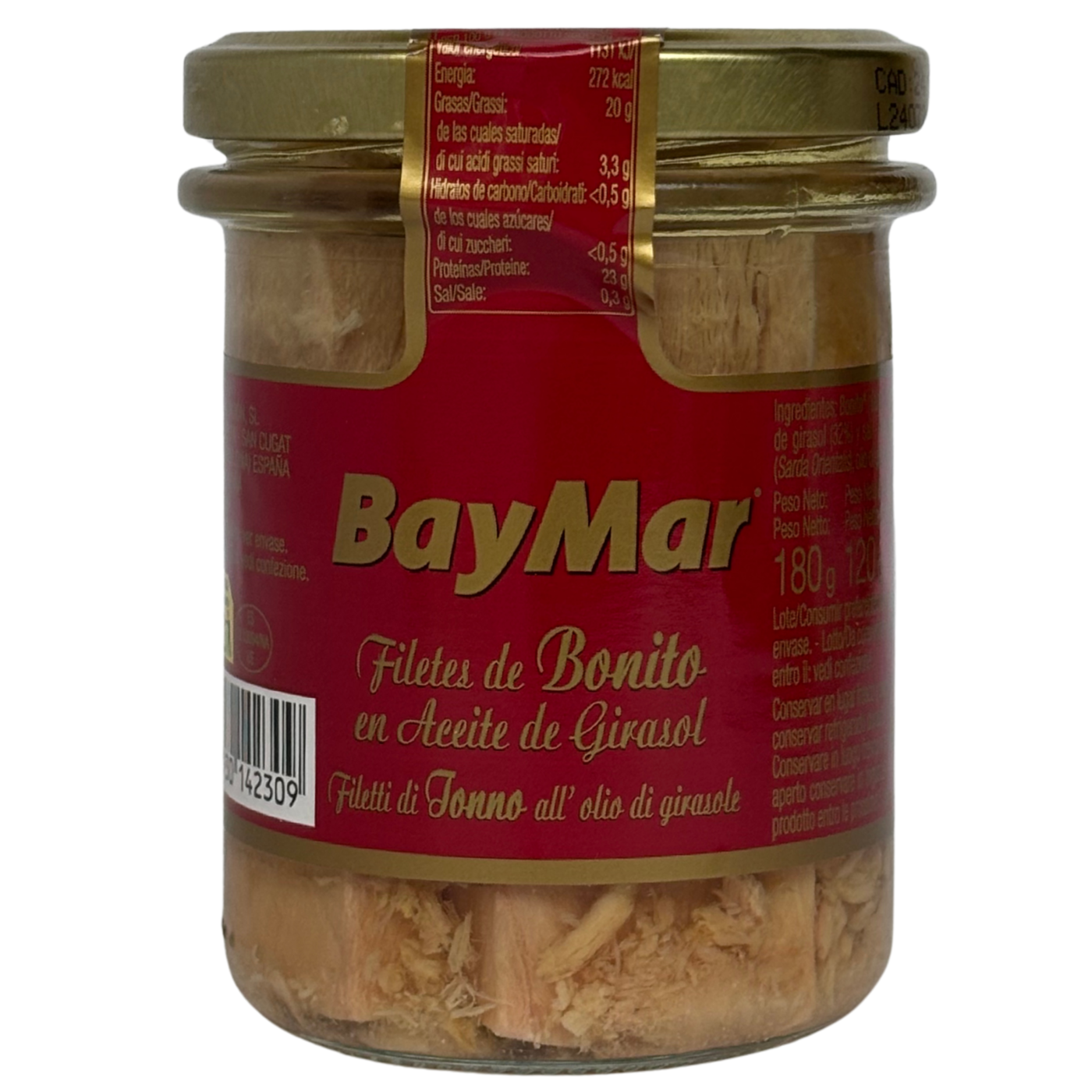 BayMar Tonno all’Olio di girasole – надзвичайно смачний та якісний тунець в соняшниковій олії, який сподобається усім, хто цінує справжній смак та якість. Він має ніжну консистенцію та делікатний смак, містить мінімум жирів, велику кількість білка, жирні кислоти – Омега-3 та Омега-6, вітаміни A, D та групи B і мінеральні речовини – фосфор, селен, цинк, залізо, калій і ін. Тунець великими брусочками ідеально підходить для приготування вишуканої страви, адже їх можна викласти зверху на гарнір або овочі.