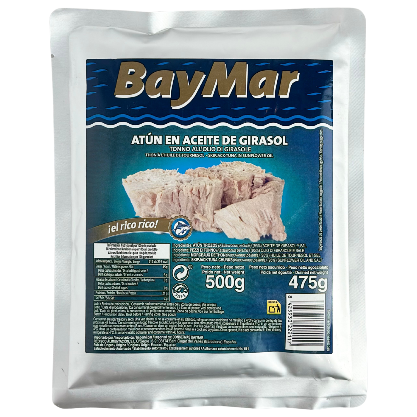 Тунець в соняшниковій олії BayMar Atún Claro en Aceite de Girasol - ніжне філе світлого тунця в легкій соняшниковій олії, що зберігає природний смак і текстуру риби. Легкий та універсальний, він підходить для салатів, паст, бутербродів або швидкого перекусу. Багатий на білок і мікроелементи, такі як йод та селен, підтримує енергію та гарне самопочуття щодня.