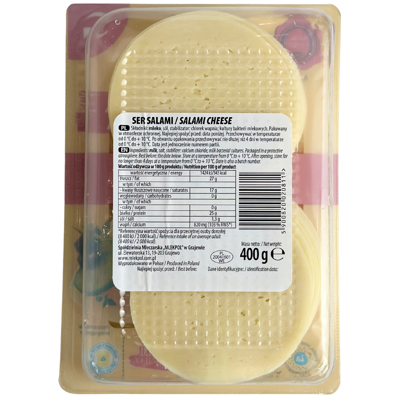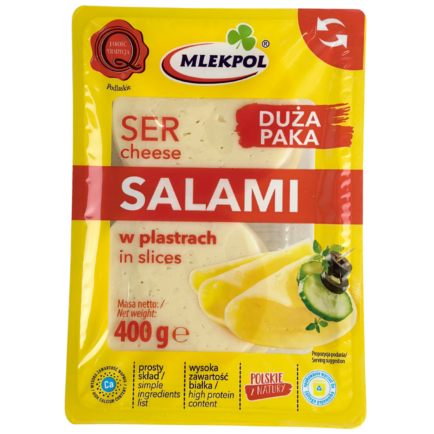 Сир Salami- це сир з коров'ячого молока з м'яким, ароматним і тонким смаком. Ідеально підходить для приготування швидких бутербродів, а також урізноманітнює меню всієї родини. Особливо сир подобається діткам. Має злегка солонуватий присмак. Нарізаний тонесенькими слайсами, що дуже практично під час пікніка або іншої поїздки.