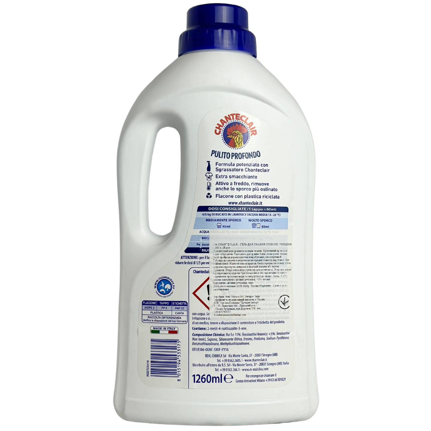 Потужний італійський засіб для глибокого очищення, який ефективно видаляє навіть найстійкіші плями. Його концентрована формула з активним плямовивідником проникає глибоко у волокна тканини, забезпечуючи ідеальну чистоту та тривале відчуття свіжості. Підходить для прання як білих, так і кольорових речей, а також делікатних тканин. Ефективний при будь-якій температурі води та не містить хлору, що робить його безпечним для шкіри та одягу. Однієї пляшки об'ємом 1260 мл вистачає до 28 прань, що робить цей засіб економічним і практичним вибором для щоденного використання. Chanteclair — відомий італійський бренд, який поєднує високу ефективність, якість і турботу про навколишнє середовище.