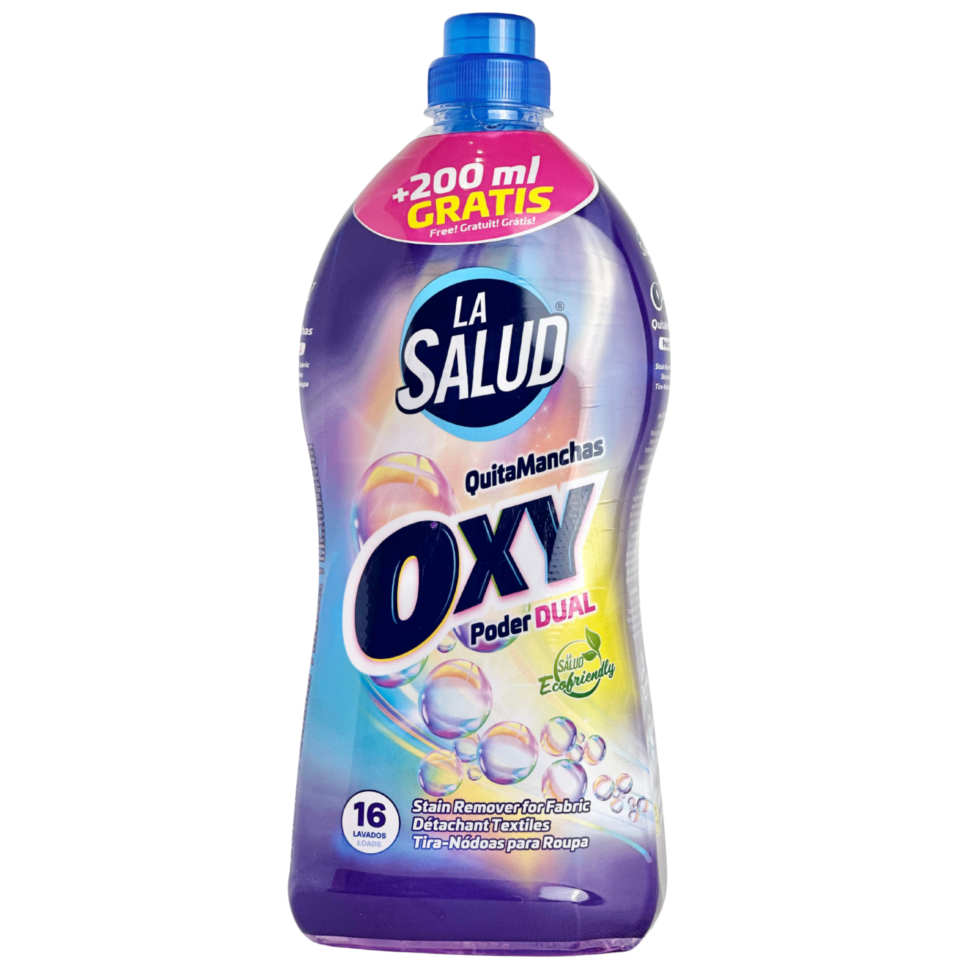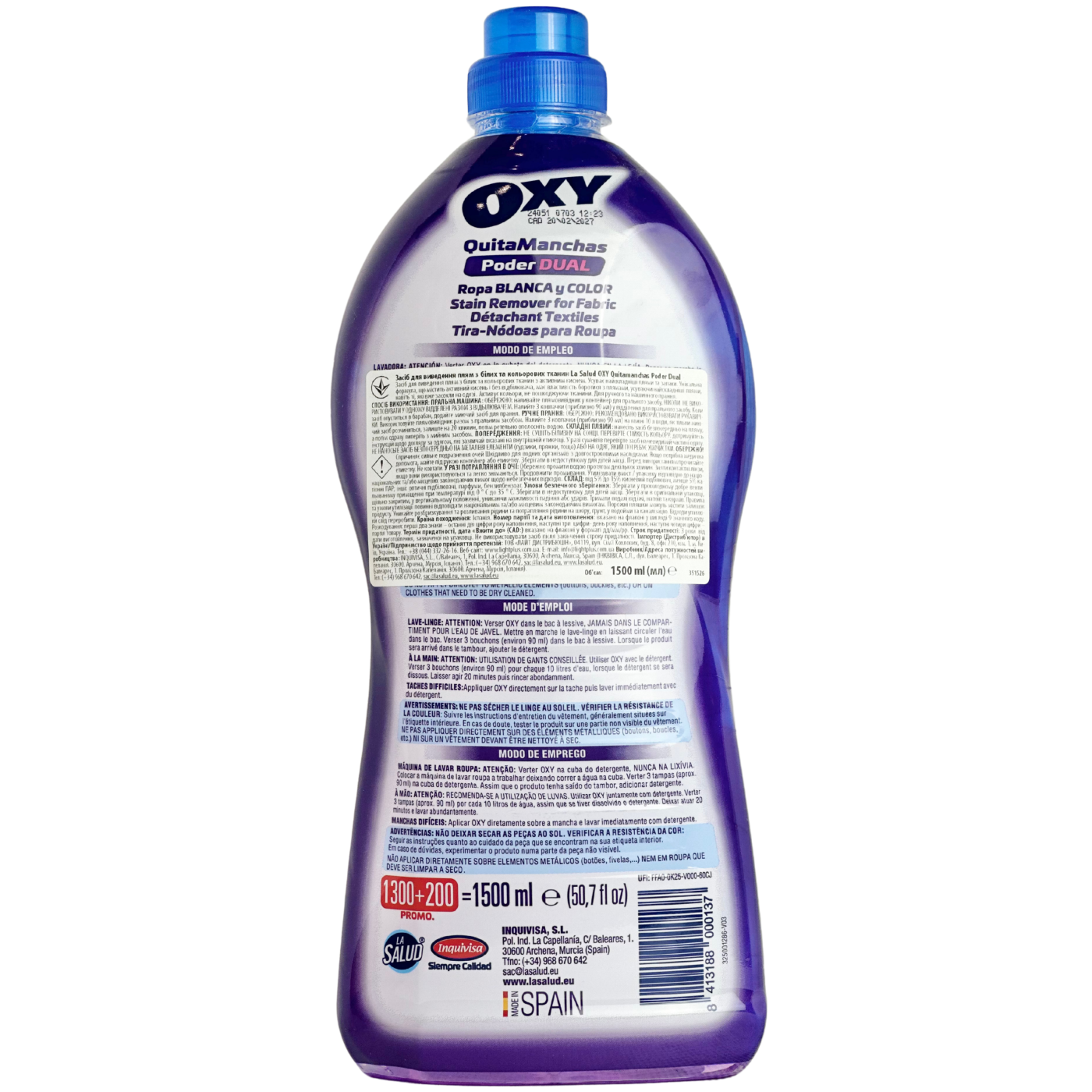 Гель плямовивідник для кольорових речей OXY Poder Dual La Salud 1,5 л — ефективний засіб для видалення складних плям з кольорової білизни. Формула з активним киснем розщеплює навіть застарілі забруднення, не пошкоджуючи тканину і зберігаючи яскравість кольорів. Продукт не містить хлору, підходить для більшості типів тканин (окрім вовни та шовку), і може використовуватися як для ручного, так і для машинного прання. Для досягнення найкращих результатів гель наноситься безпосередньо на плями або додається у пральний відсік. Об’єм 1,5 л розрахований приблизно на 16 прань. Засіб економічний, безпечний і зручний у використанні, ідеально підходить для догляду за кольоровими речами.