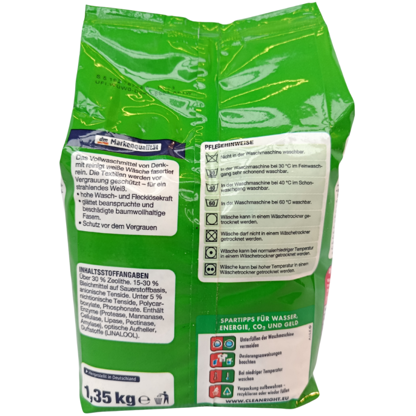Vollwaschmittel Denkmit – це порошок від німецького виробника, який збереже ваші білі речі від сірості та забезпечить чистоту і свіжість, адже він легко впорається з різними плямами та неприємним запахом. Що важливо, його дія проявляється навіть при 20 градусах, що додає зручності при використанні. Порошок розрахований на 20 повних циклів машинного або ручного прання.