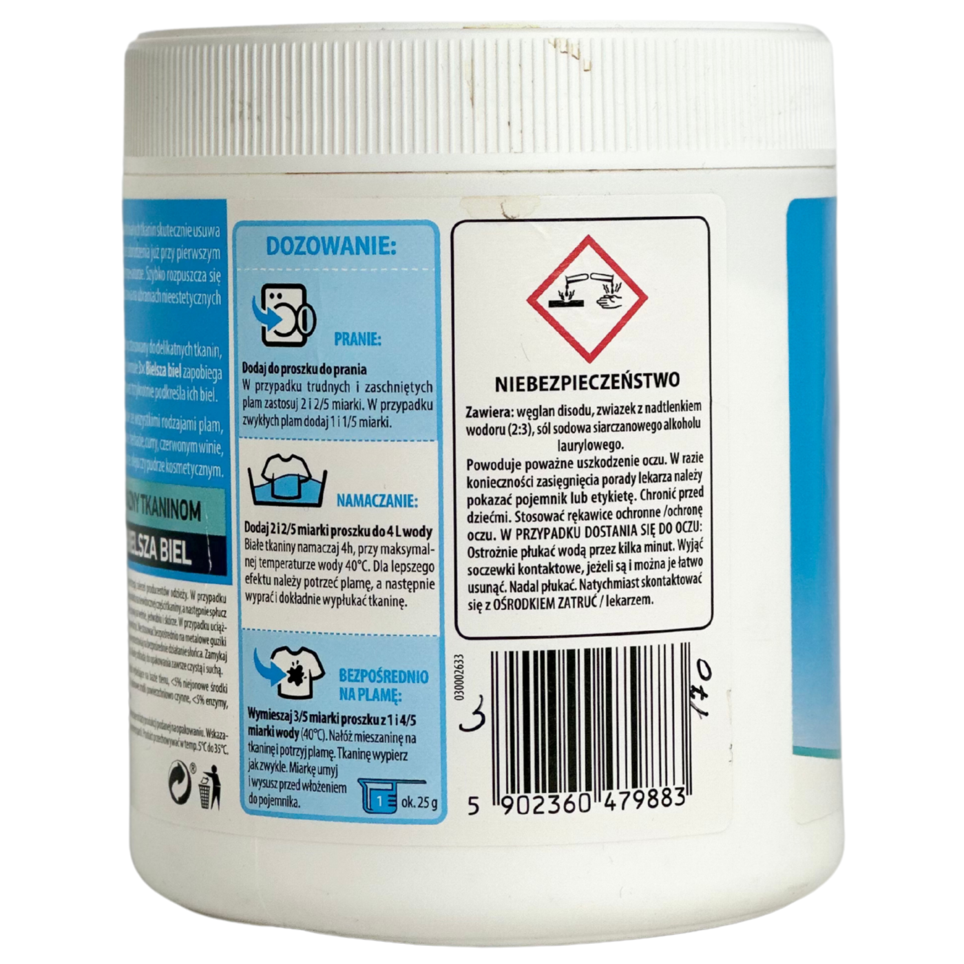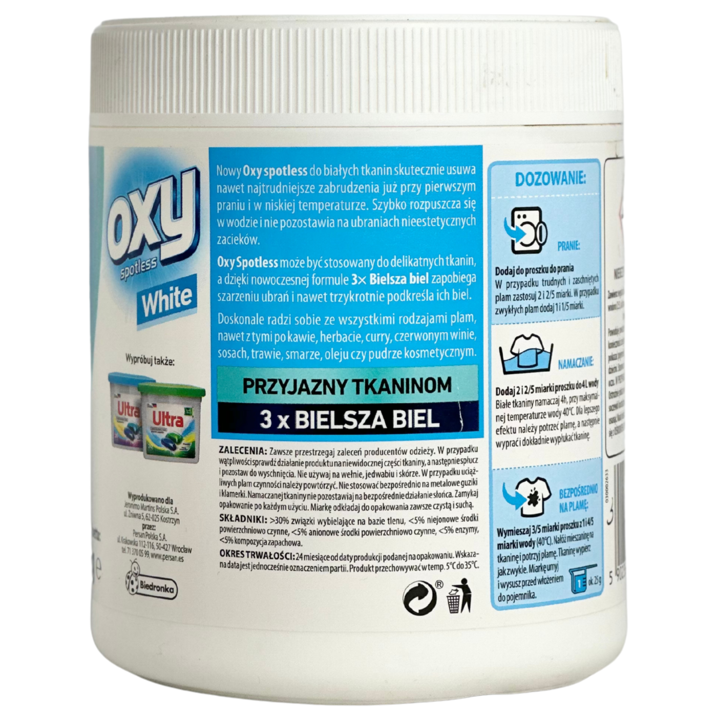 Порошок плямовивідник для білих тканин OXY Color 730 г — ефективний засіб для видалення складних плям з білих і світлих тканин, який делікатно повертає білизну без пошкодження волокон. Завдяки активним кисневим компонентам, порошок розщеплює плями від кави, вина, трави, жиру та інших забруднень, одночасно освітлюючи тканину і запобігаючи жовтизні. Засіб підходить для використання як при машинному, так і ручному пранні, зберігає яскравість і свіжість білих речей навіть після багаторазового прання. Порошок OXY Color легко розчиняється у воді, підходить для різних типів тканин і є надійним помічником у домашньому догляді за білим одягом.