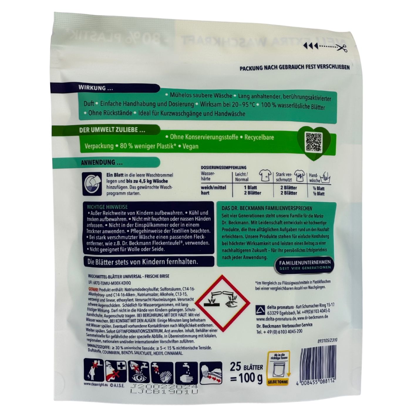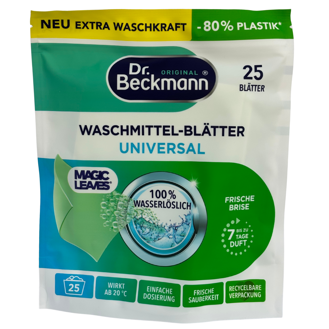Серветки для прання Dr. Beckmann Magic Leaves Universal - це інноваційний та екологічний спосіб догляду за вашими речами. Кожна серветка повністю розчиняється у воді навіть при низьких температурах (від 20°C), забезпечуючи бездоганну чистоту та свіжість білизни. Вони надзвичайно легкі у використанні: просто покладіть одну серветку в барабан пральної машини разом з одягом. Завдяки компактному формату їх зручно зберігати та брати з собою в подорожі, а універсальна формула підходить як для білих, так і для кольорових тканин, ефективно видаляючи забруднення та зберігаючи структуру волокон