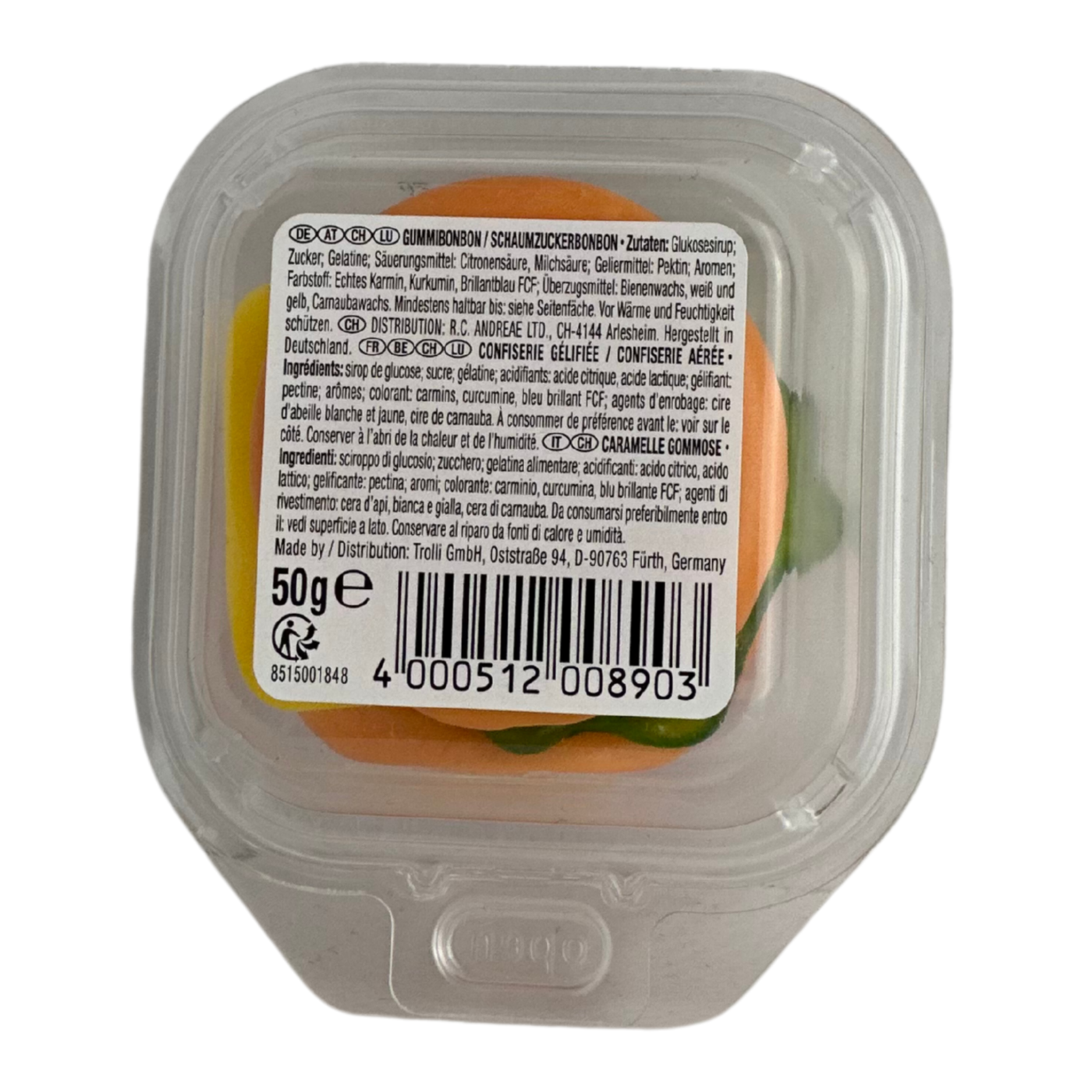 Веселі та смачні желейні бургери Trolli Big Burger — ідеальне поєднання яскравого дизайну та фруктового смаку! Кожен “бургер” складається з кількох м’яких шарів желе, що нагадують справжній гамбургер: булочка, сир, котлета та овочі — усе з натуральними барвниками та ароматами. Цукерка має ніжну, жувальну текстуру і приємний фруктовий післясмак. Trolli Big Burger — це не лише солодкий перекус, а й цікава розвага для дітей та дорослих. Ідеально підходить як сюрприз, подарунок або декор для святкового столу.