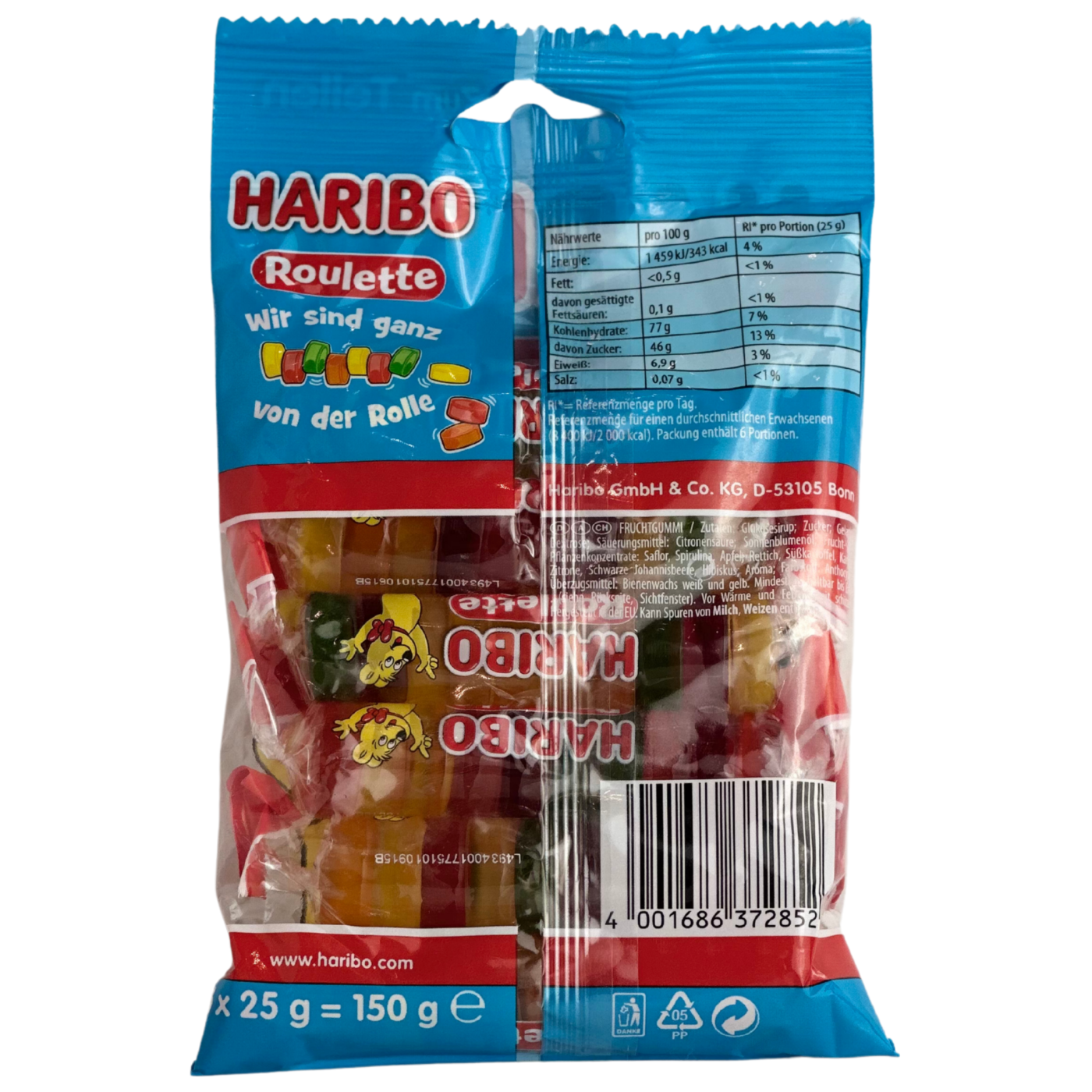 Желейні цукерки Haribo Roulette - це набор желейок у формі таблеток із фруктовими смаками. В упаковці 6 рулетиків, кожен окремо запакований, тому Їх зручно взяти із собою в дорогу, на прогулянку чи на роботу. Вони дуже компактні, не займуть багато місця. Цукерки Haribo Candy дебютували у світі цукерок у 1922 році. Вони відомі тим, що створили перших у світі гумових ведмедиків. За ці роки Haribo значно розширилися, пропонуючи нам незліченну кількість форм, смаків і розмірів смачних желейок.