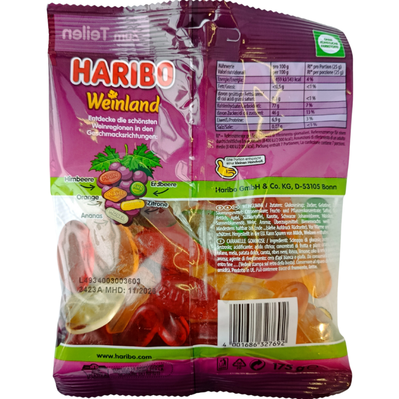 Желейні цукерки Haribo Weinland — це популярні фруктові жувальні солодощі з м’якою текстурою та насиченим смаком. Цукерки виконані у формі невеликих фігурок з назвами річок і виноробних регіонів Німеччини, що робить їх цікавими та оригінальними. У наборі представлено кілька фруктових смаків: ананас, полуниця, малина, апельсин та лимон, які створюють яскраве та збалансоване поєднання солодких і злегка кислих ноток. Особливістю цих желейок є використання справжнього вина у рецептурі, але під час виробництва алкоголь повністю випаровується, тому продукт не містить алкоголю і підходить для широкого кола споживачів.