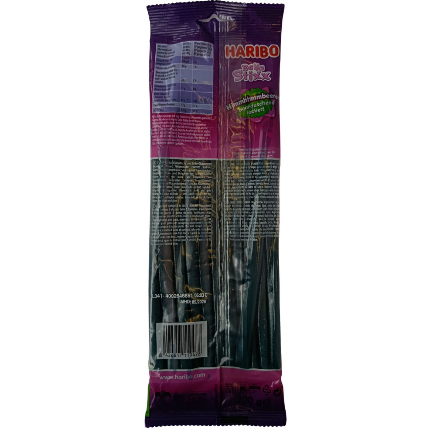 Balla Stixx Raspberry Blackberry Haribo - смачні та яскраві желейні ласощі для дітей і дорослих. Поєднання соковитої малини та ароматної ожини створює насичений фруктовий смак у кожній паличці. Ці палички мають приємну жувальну текстуру та зручну форму, яка робить їх ідеальними для перекусів.