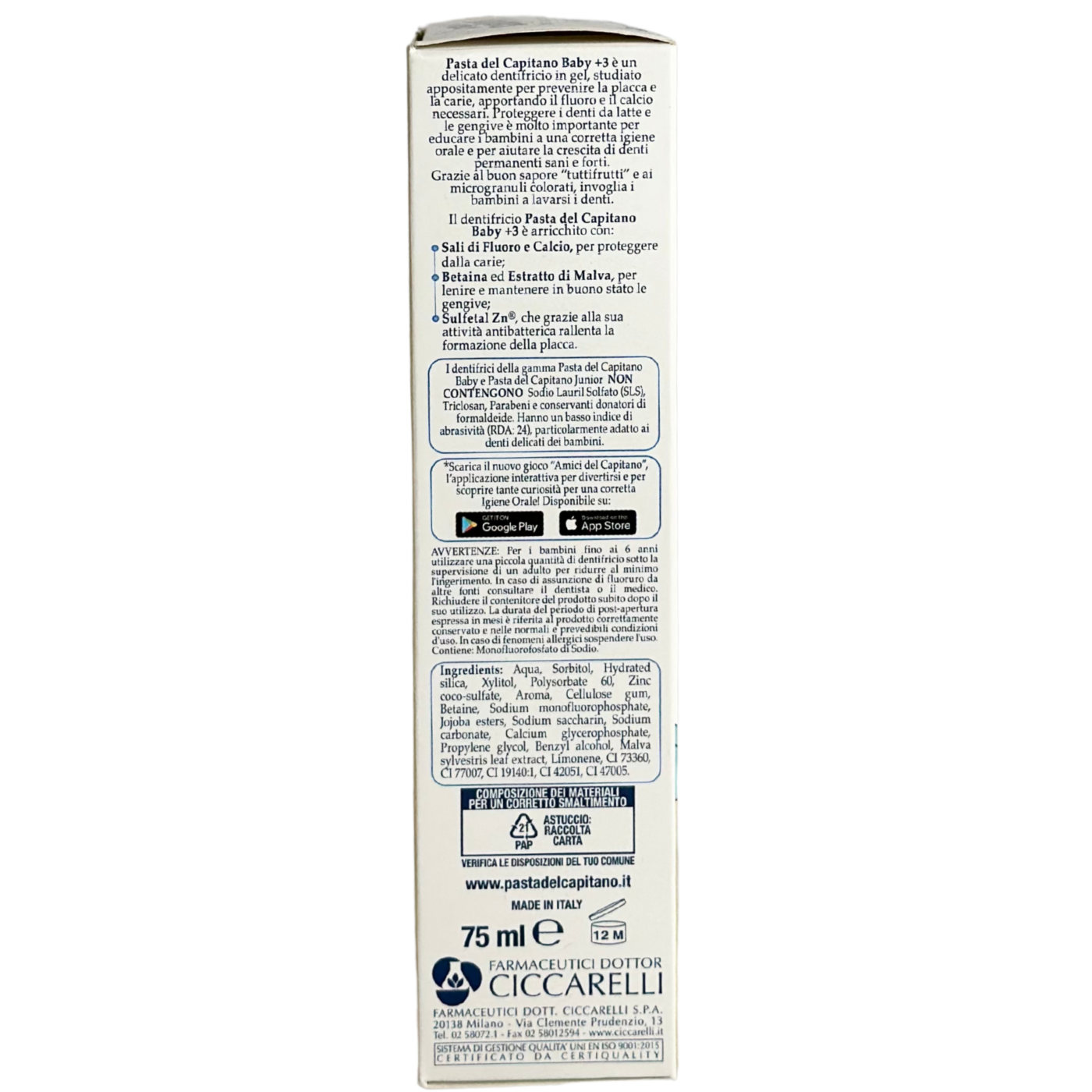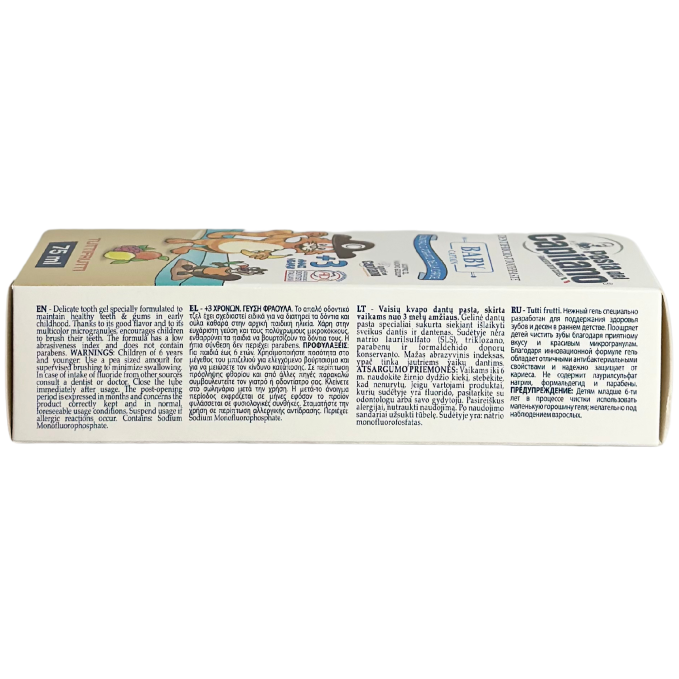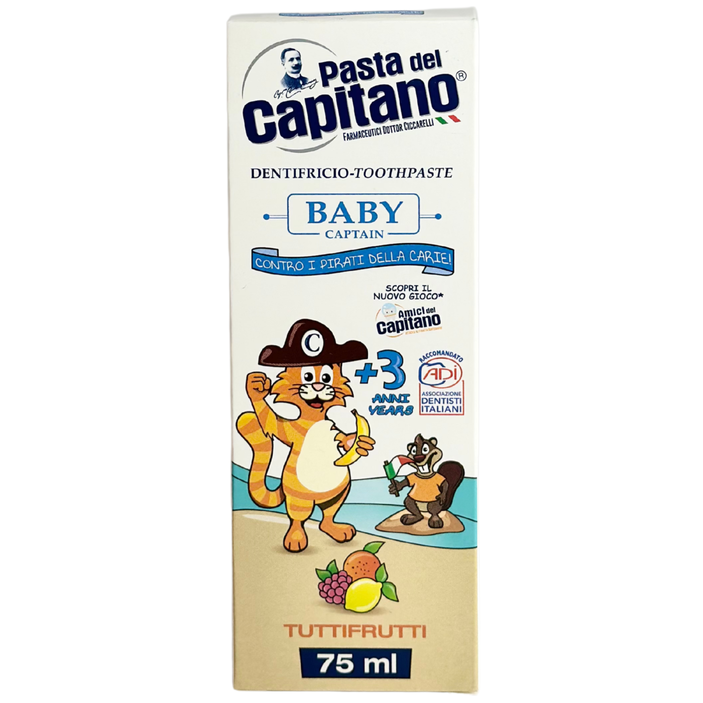 Зубна паста дитяча Tuttifrutti Capitano (3+) - ніжна і смачна паста з ароматом «тутті‑фрутті», спеціально створена для дітей від 3 років. Формула м’яко очищає зуби, допомагає захищати від карієсу та робить щоденне чищення приємним та веселим. Паста легко піниться, має приємний фруктовий смак і сприяє формуванню правильних гігієнічних звичок у дітей.